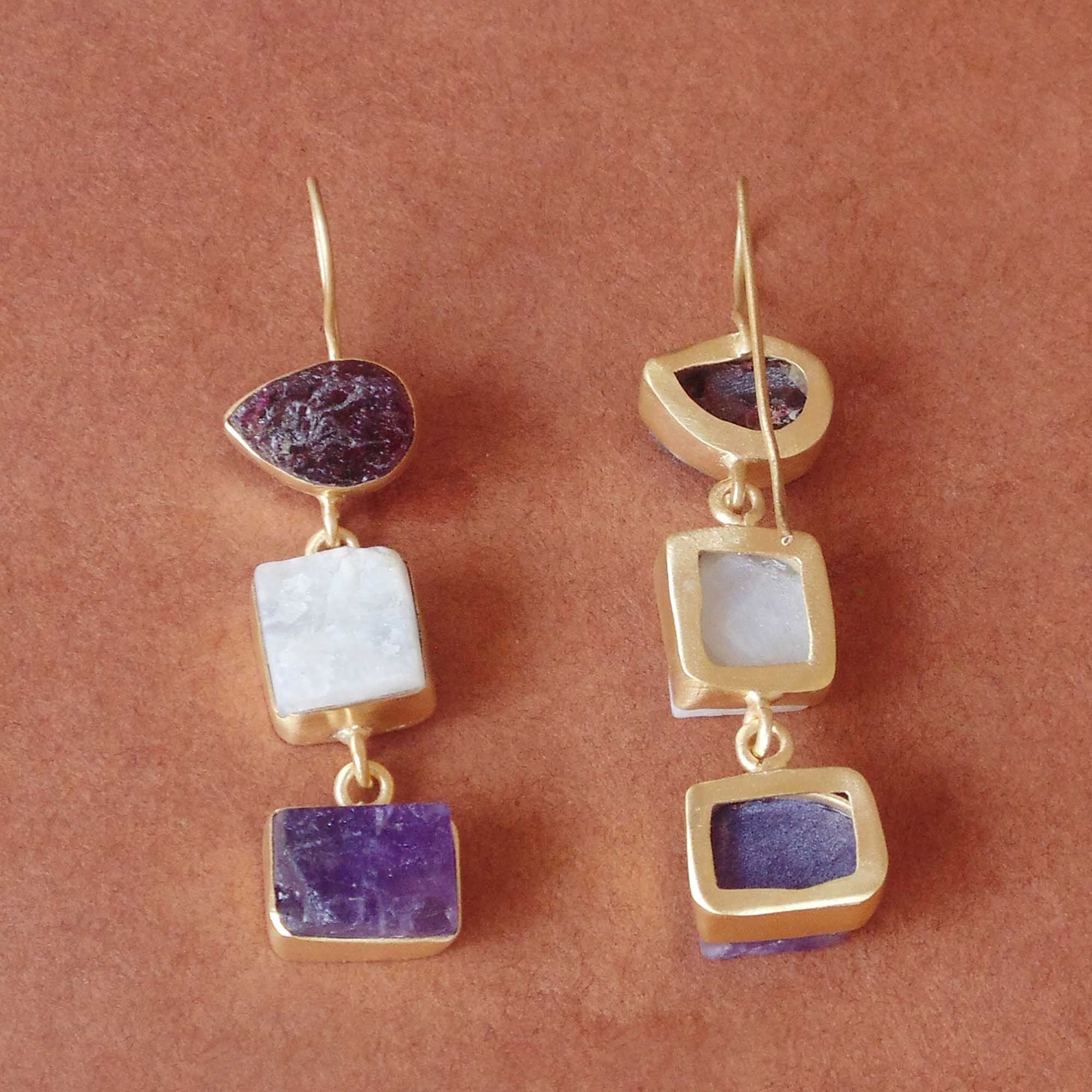 Eclectic with its contemporary design element these lovely bezel set three stone earrings are a thing of beauty. The deep colour of the raw garnet and the calming hue of the rainbow moonstone is a perfect accompaniment for your bridesmaids on your special day.