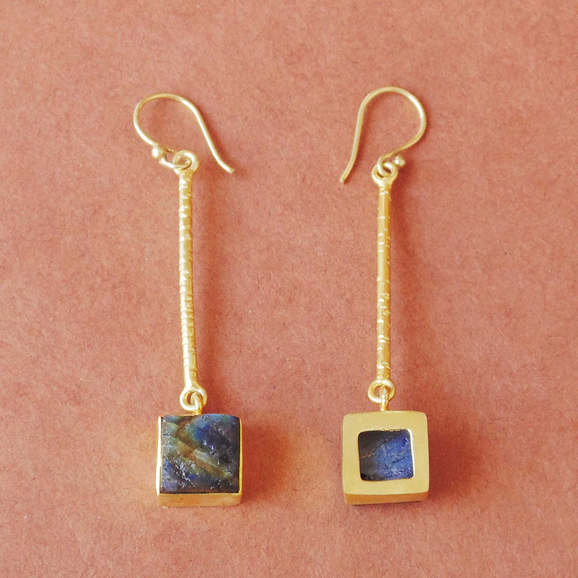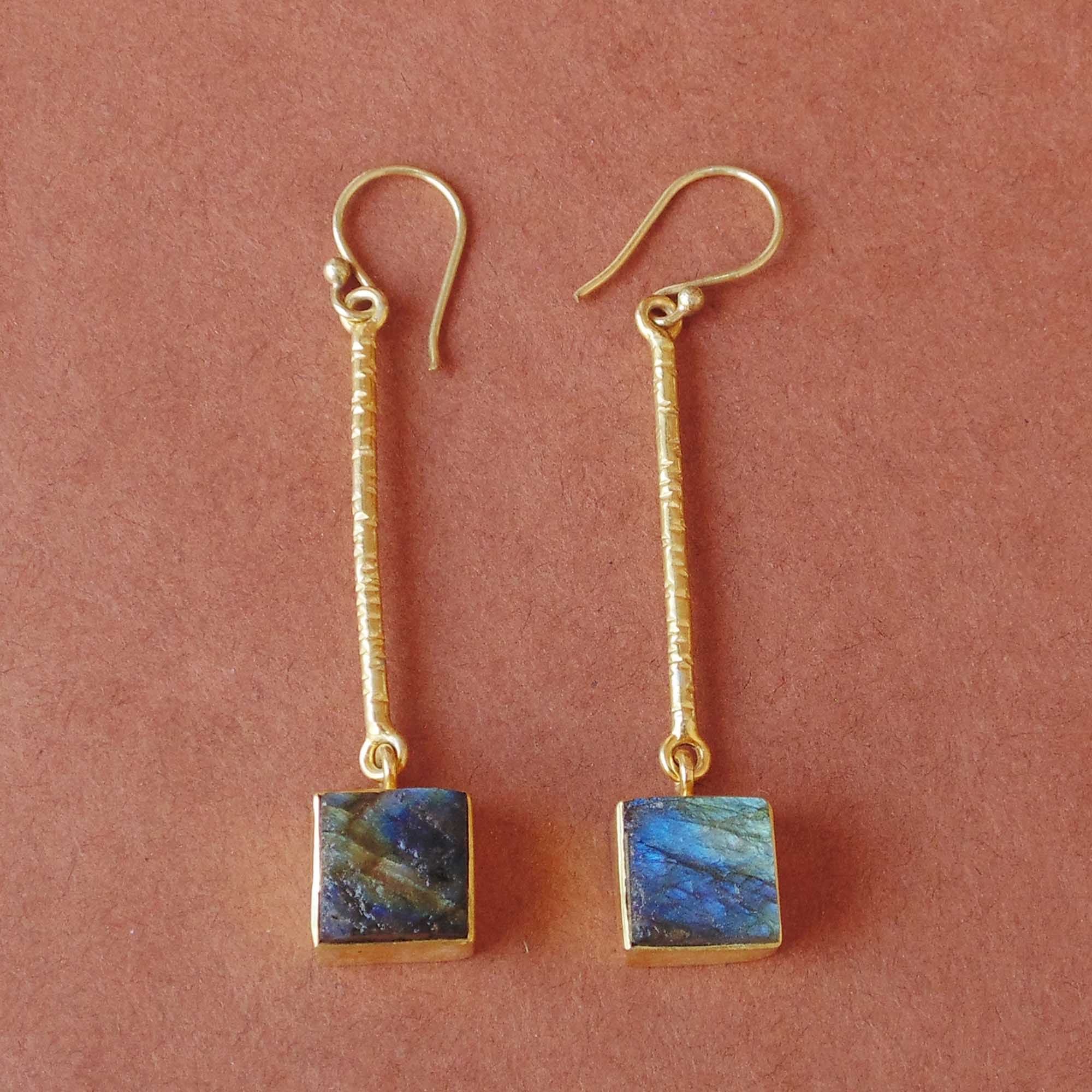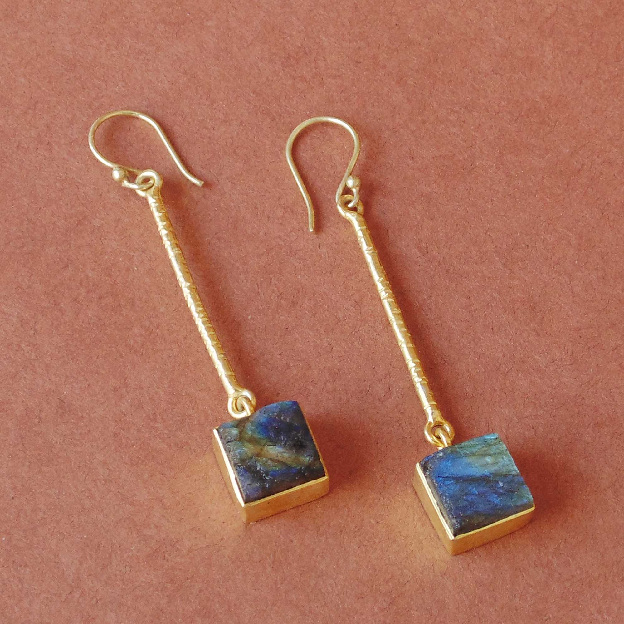 Bhagat Jewels artisan have made this earring lovingly to dazzle your everyday style. These long metallic dangle earrings have luminescent labradorite square at the bottom to add to its fun element. They are extremely light-weight, making them perfect for daily wear.