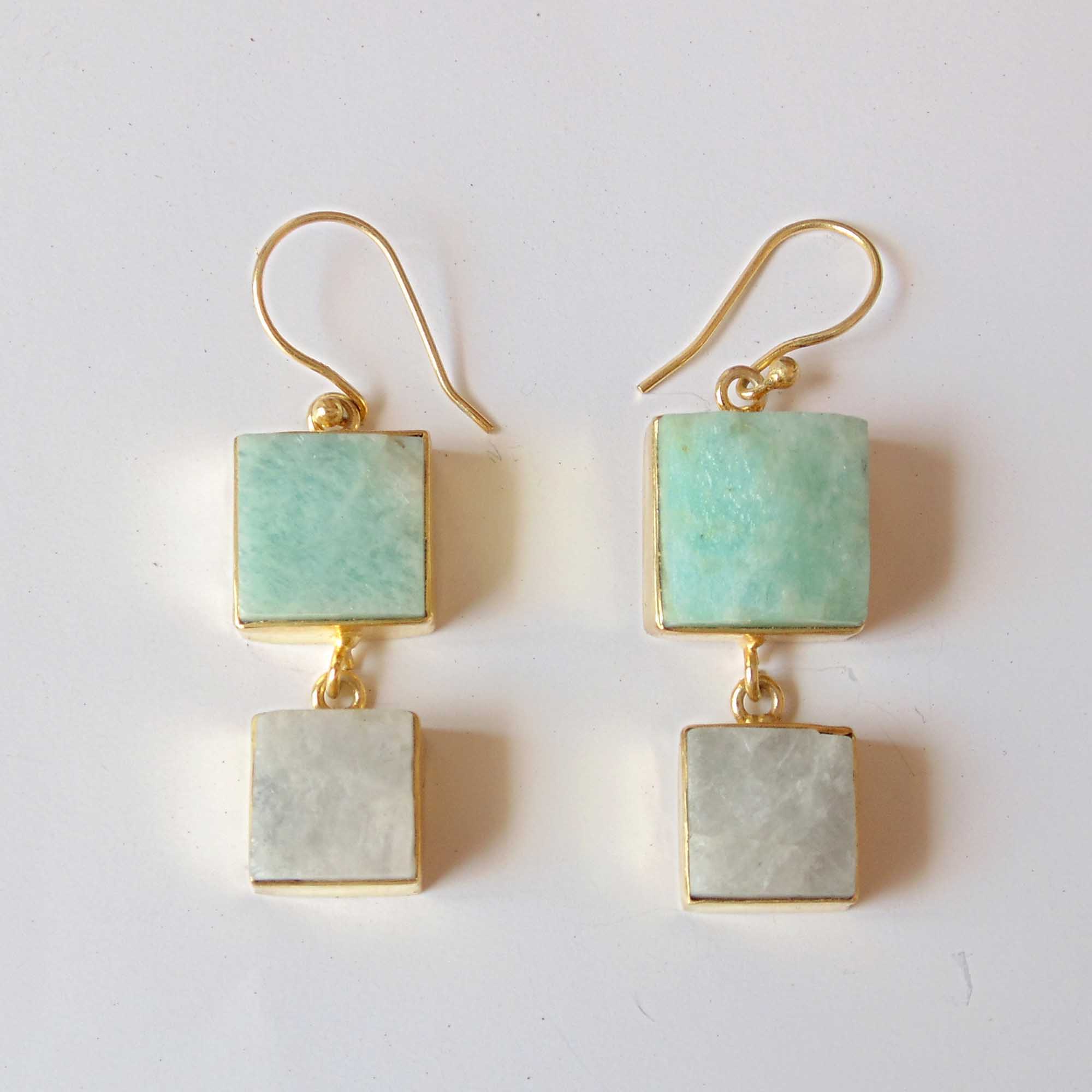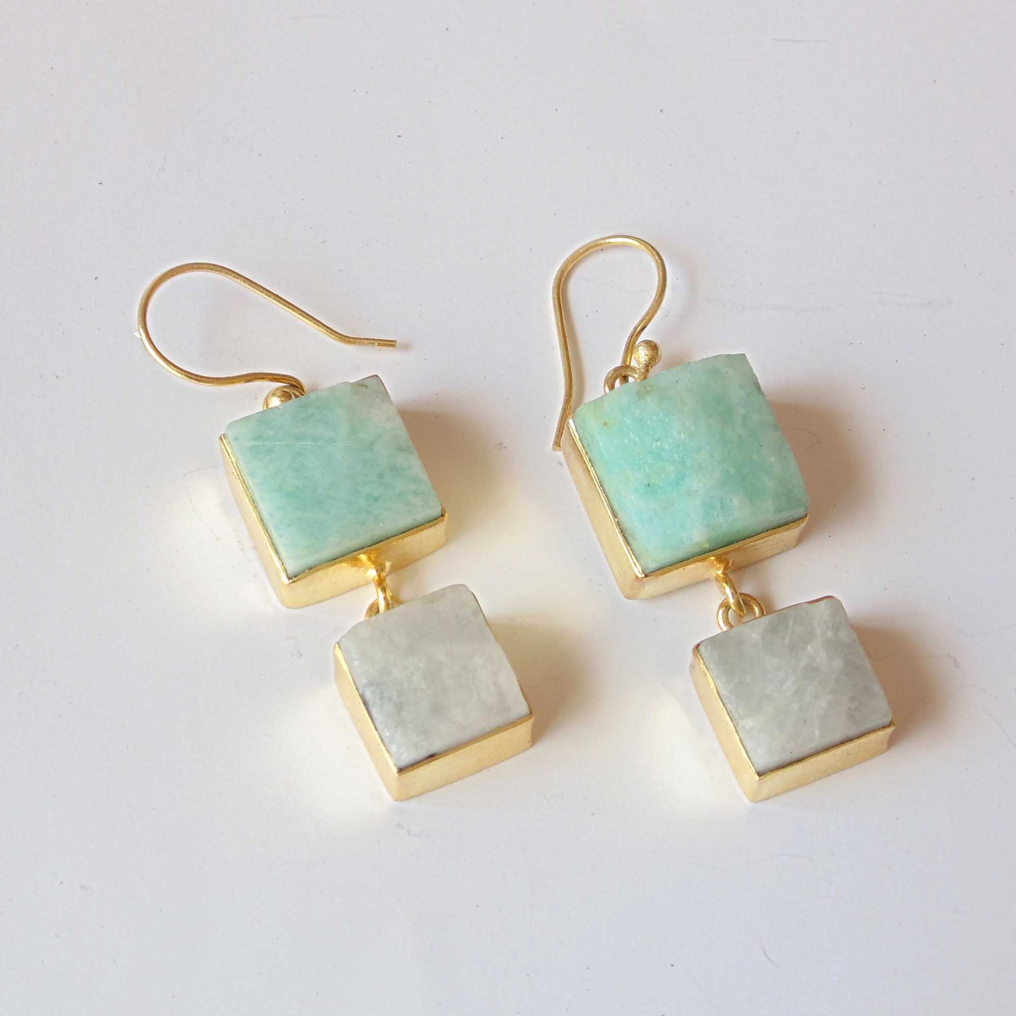 Subtle elegance of the natural amazonite and the rainbow moonstone is hard to miss. Gold plated brass holds the striking raw gemstones. These dainty golden dangle earrings are the perfect choice for workplace or even a party.
