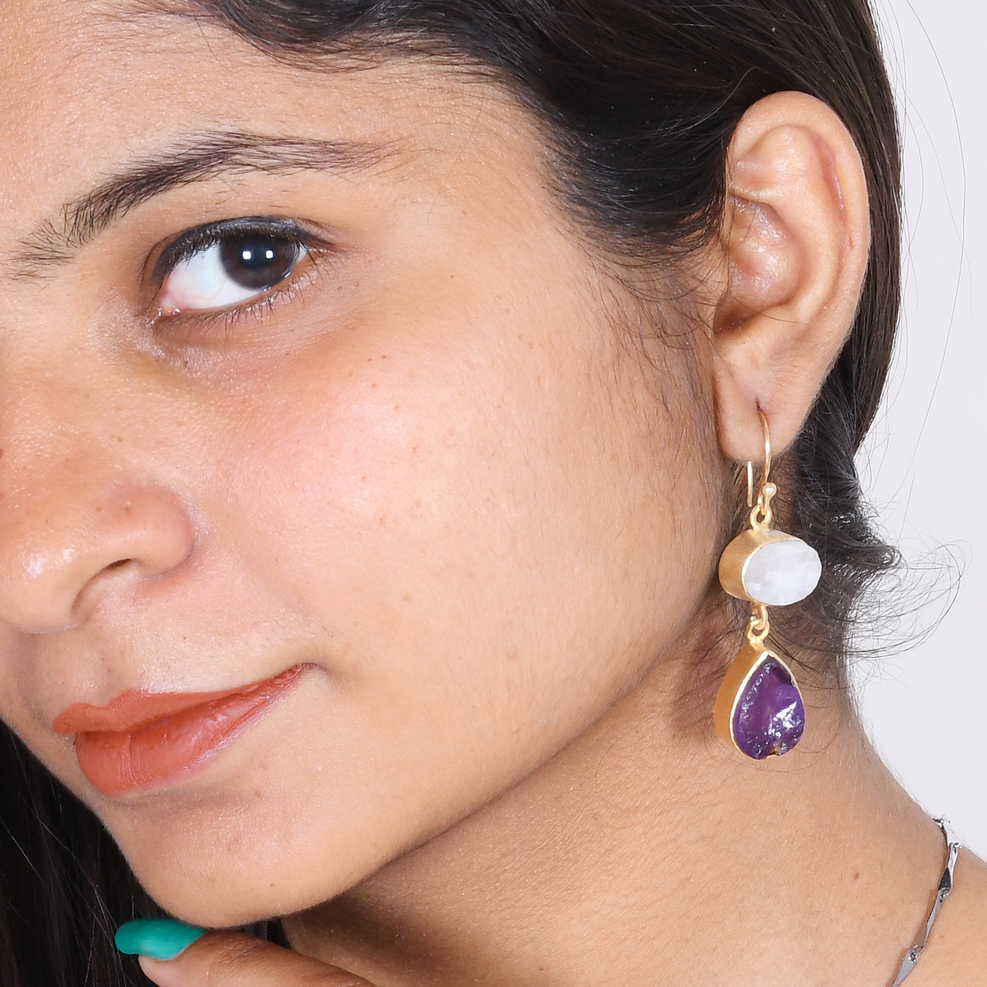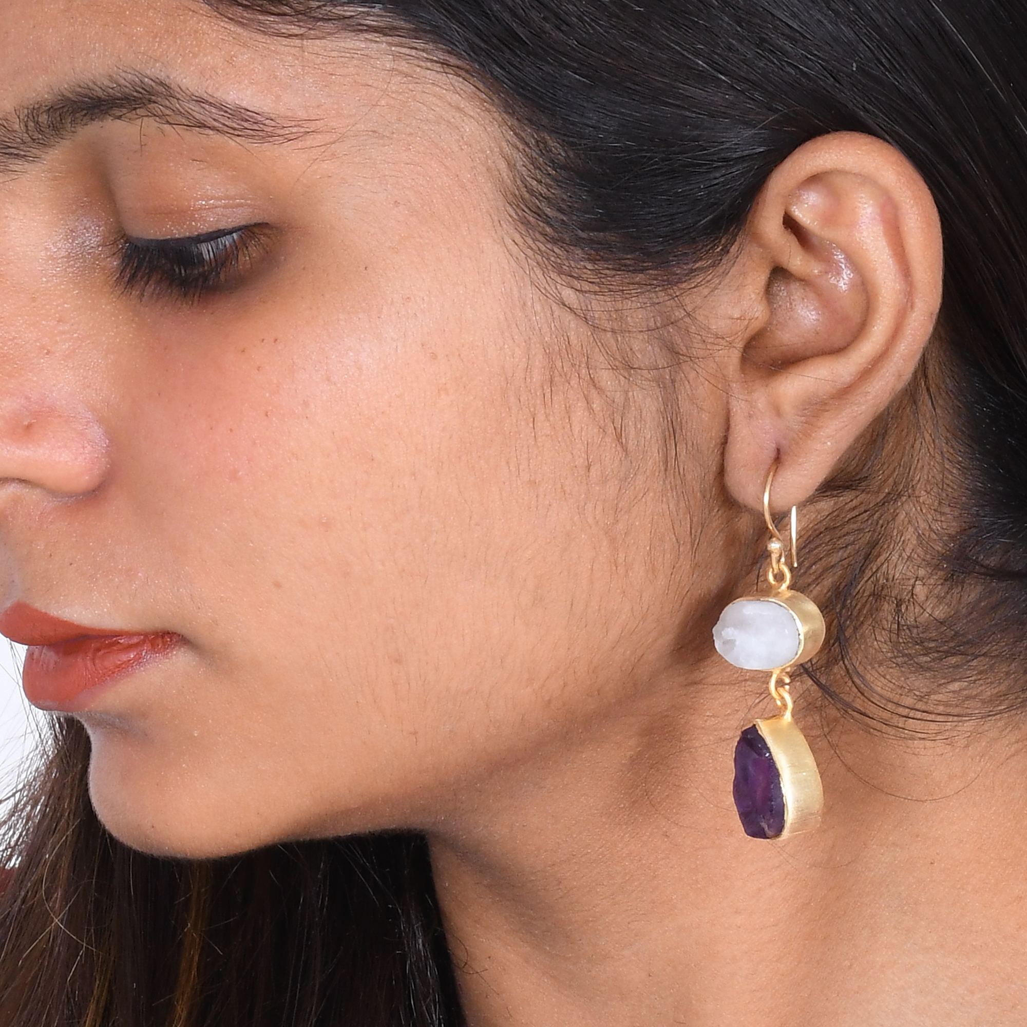 Organic Rainbow Moonstone And Amethyst Gemstone Metalwork Earrings