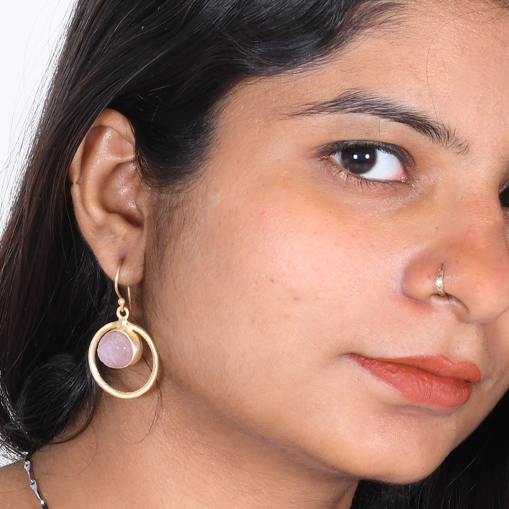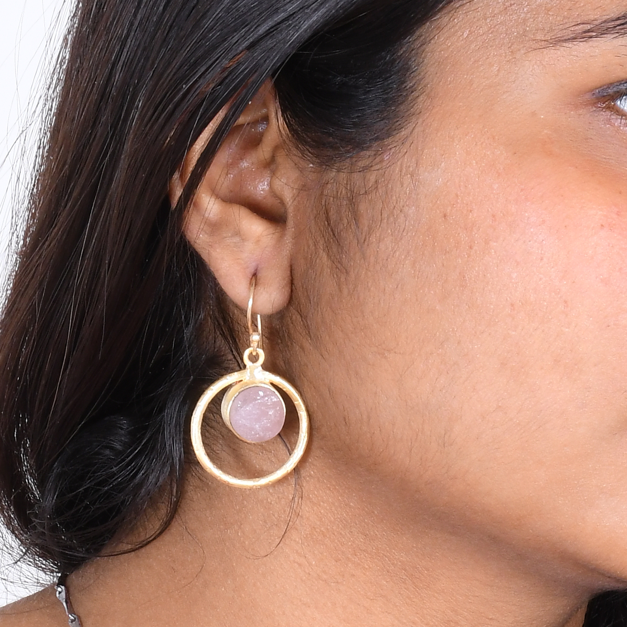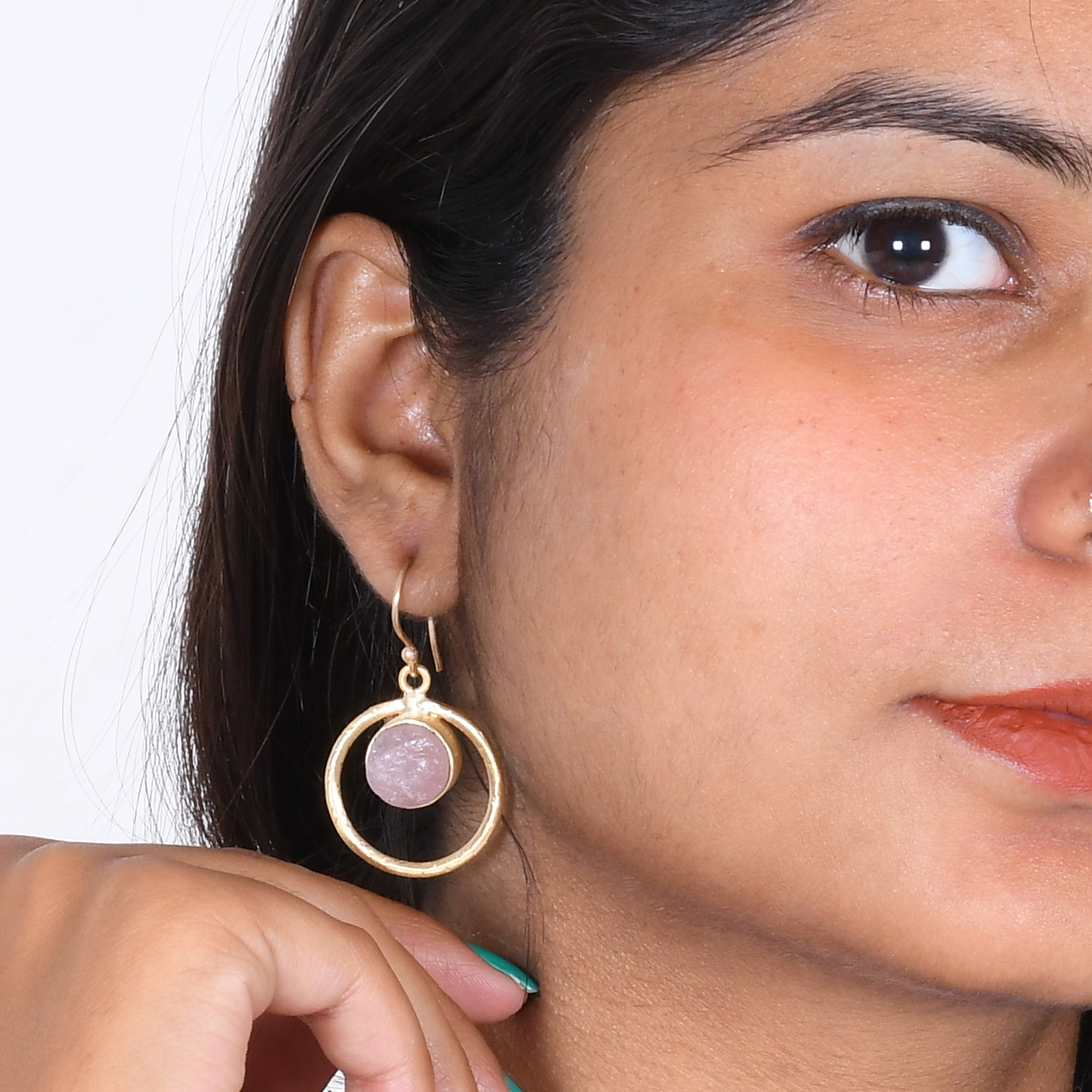 We love a minimalist style for its modern chic and versatility. Created by our local artisans in high-grade brass, this simple open circle earrings is made using romantic rose quartz and is attached by a dainty hook for movement. The energy of rose quartz vibrates in alignment with the energies of the heart chakra and encourages feelings and expressions of happiness. This stunning piece exudes timeless elegance and is very lightweight and also affordable.