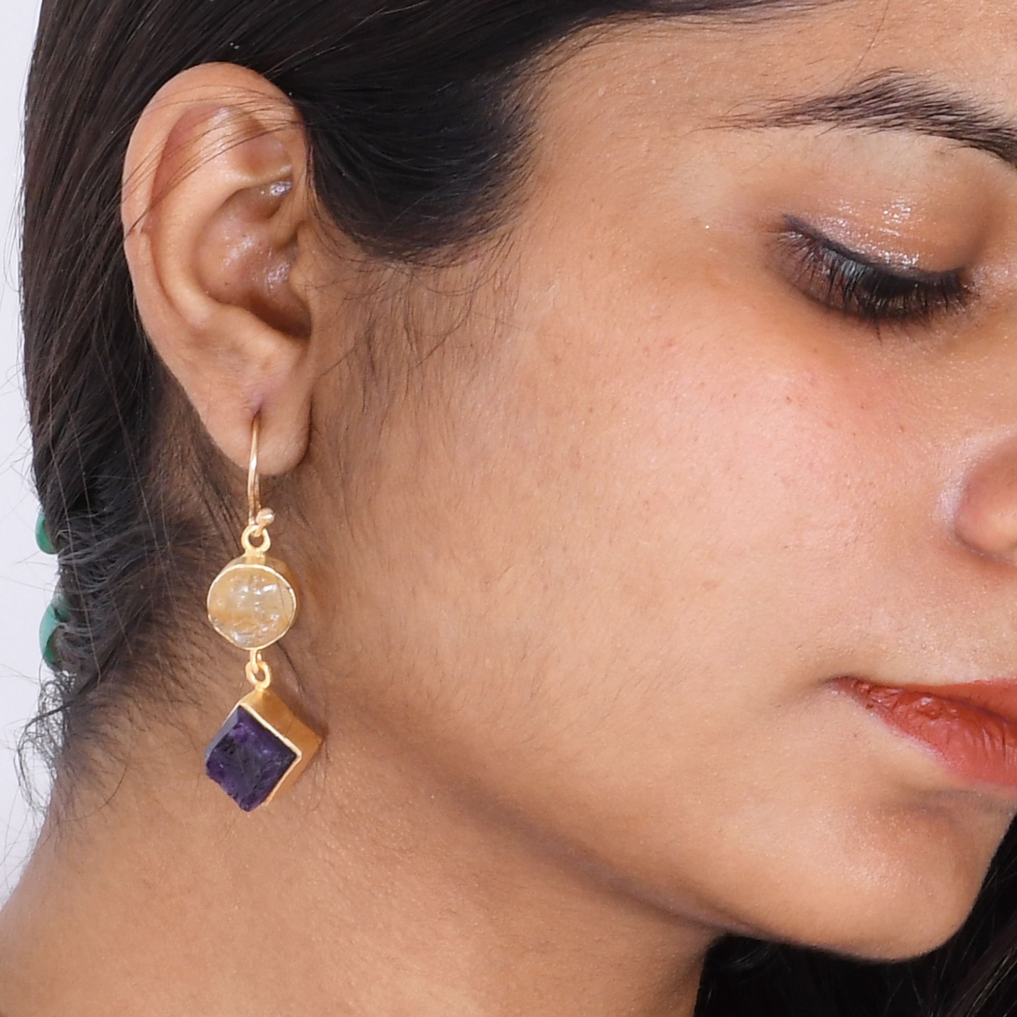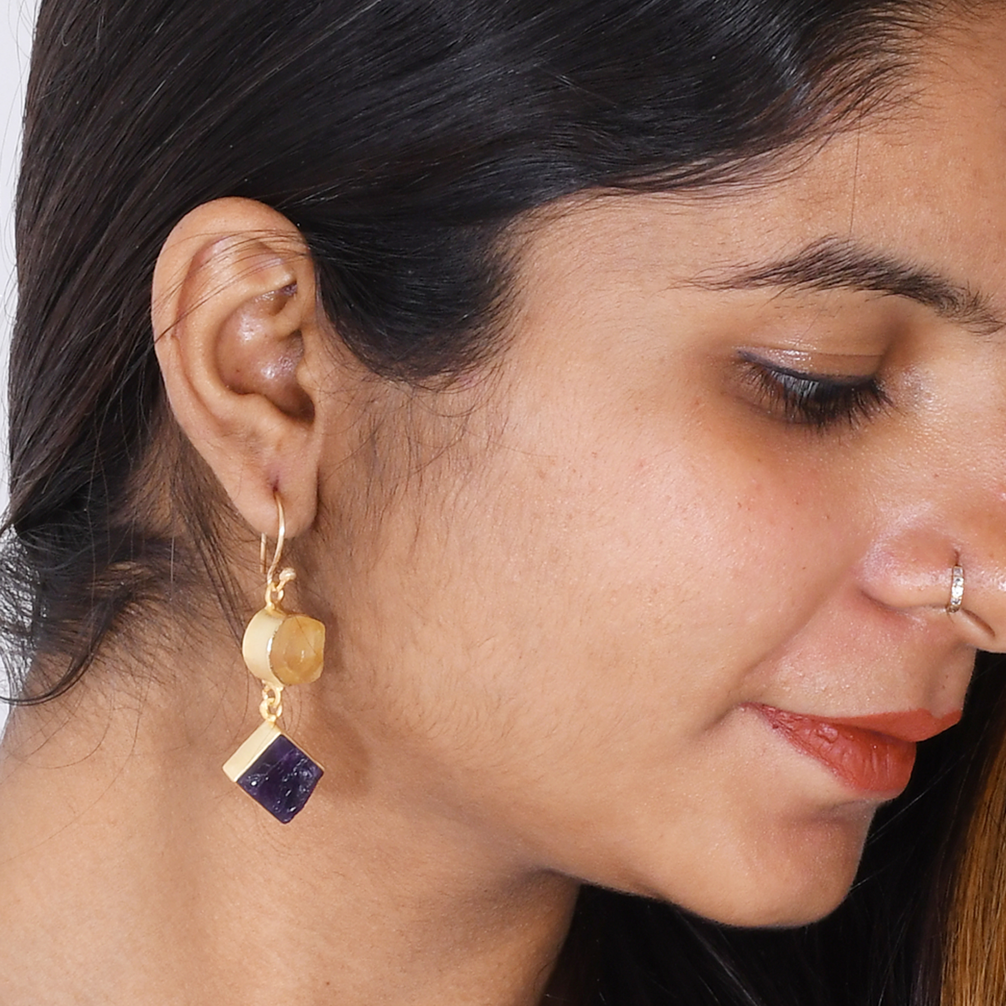 Handmade Natural Citrine And Amethyst Dual Stone Everyday Wear Earrings
