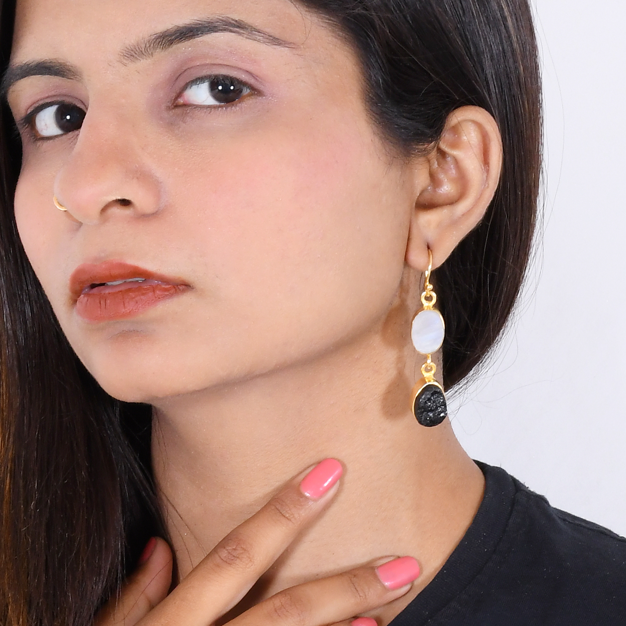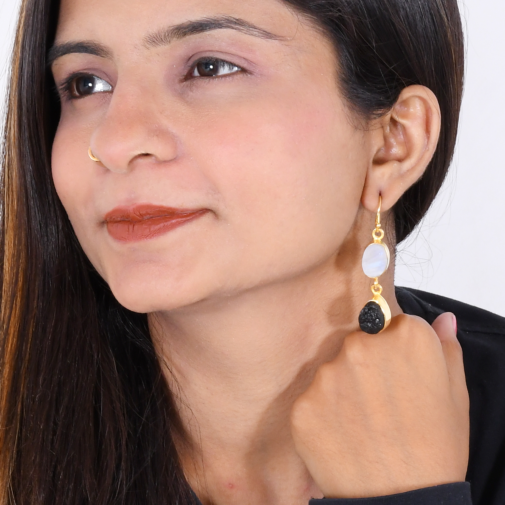Natural Rainbow Moonstone And Black Tourmaline Dual Birthstone Bridal Earrings
