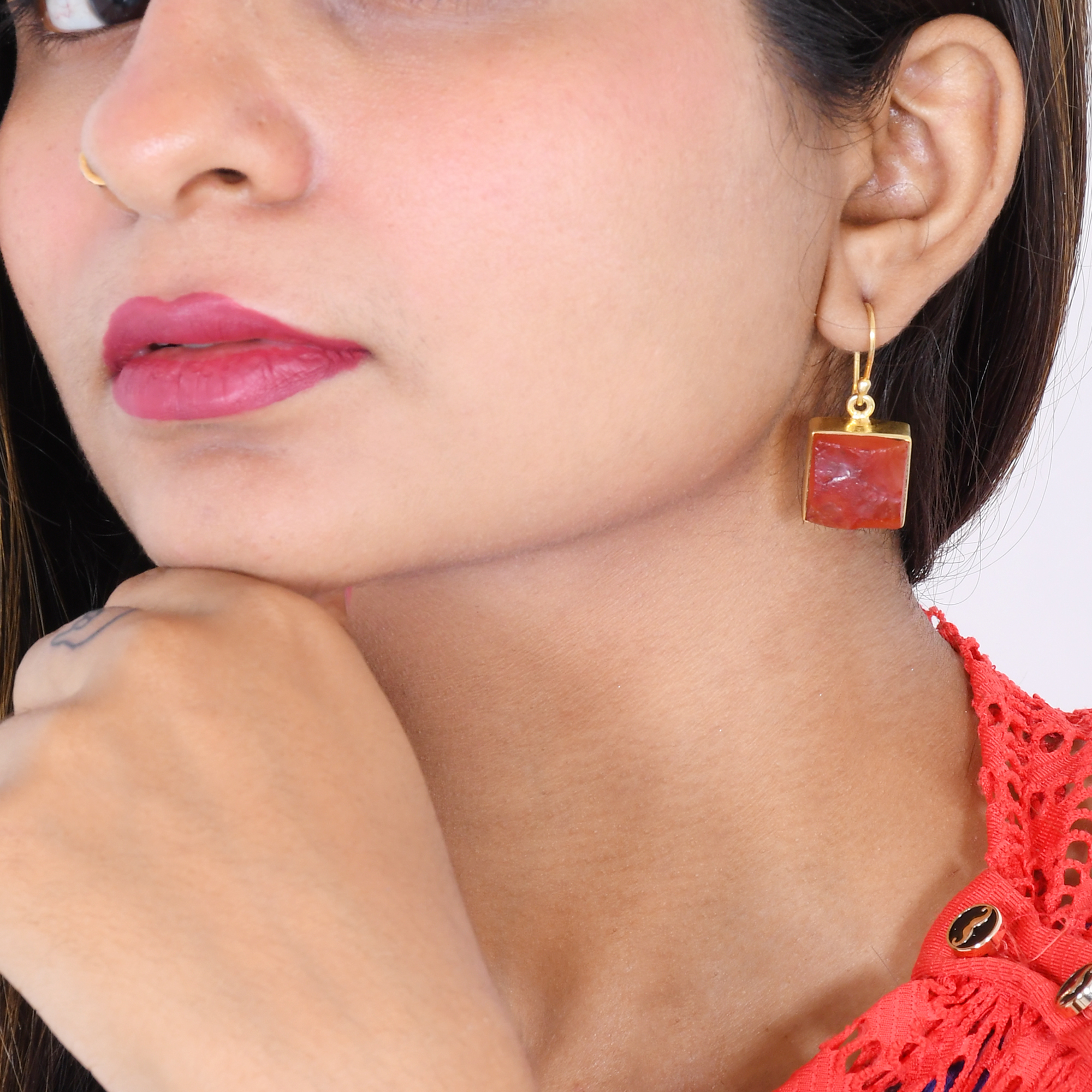 The deep red of this handmade high-quality raw carnelian earrings is lustrous and gives a royal vibe. The small drop bezel set design on 18-karat yellow gold vermeil makes for a precious gift.