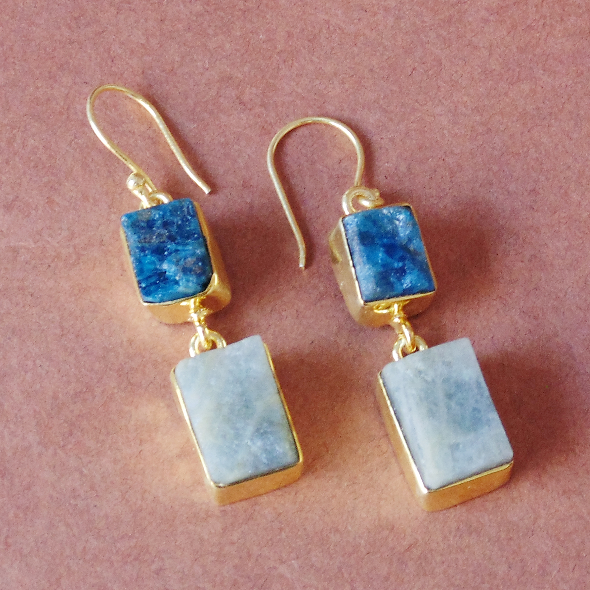 The most trendy and stylish. we have created these dangle earrings for the women of style. Made with natural aquamarine and apatite these dangle earrings are fashioned using high grade brass. Retaining the natural texture of the gemstone adds to the personality of these earrings. Simple dangle design allows movement and is comfortable for everyday use.