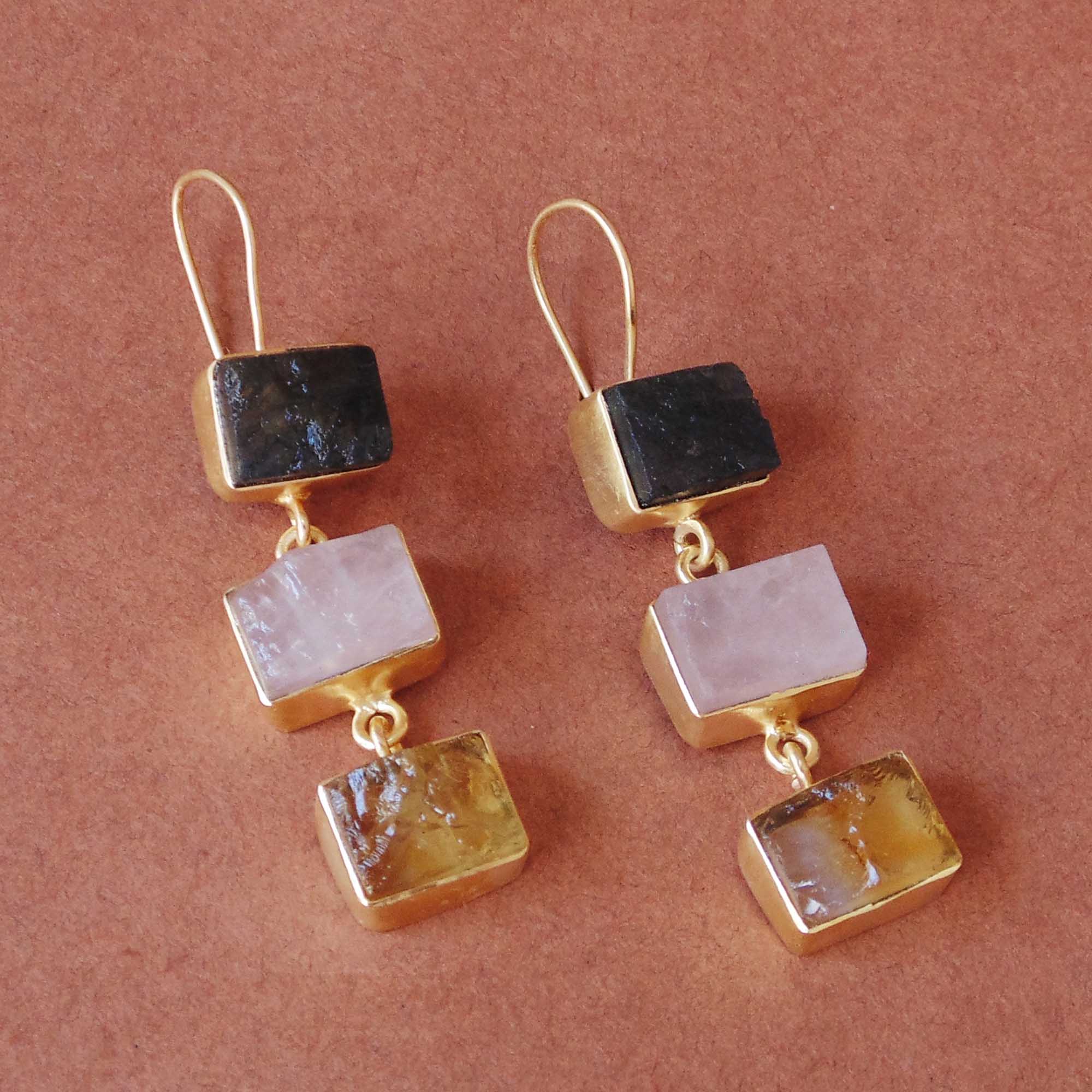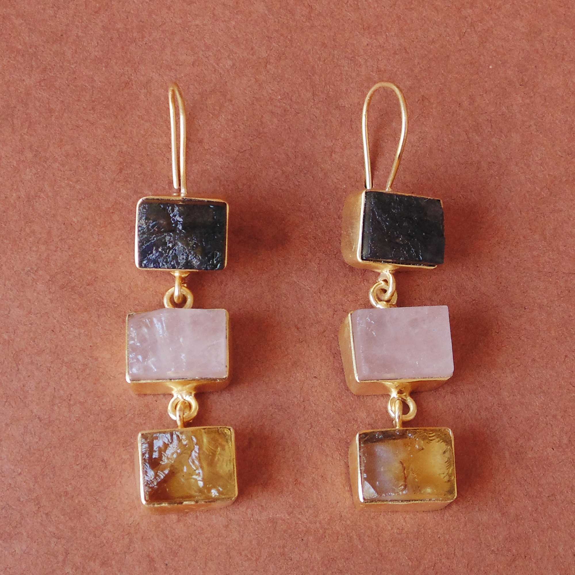 Hand-crafted in India. The elegance of Labradorite, Rose Quartz and citrine is beautifully harmonized in these triple stone earrings. The 18k yellow gold plating brass gives the dangle earrings an added luster.