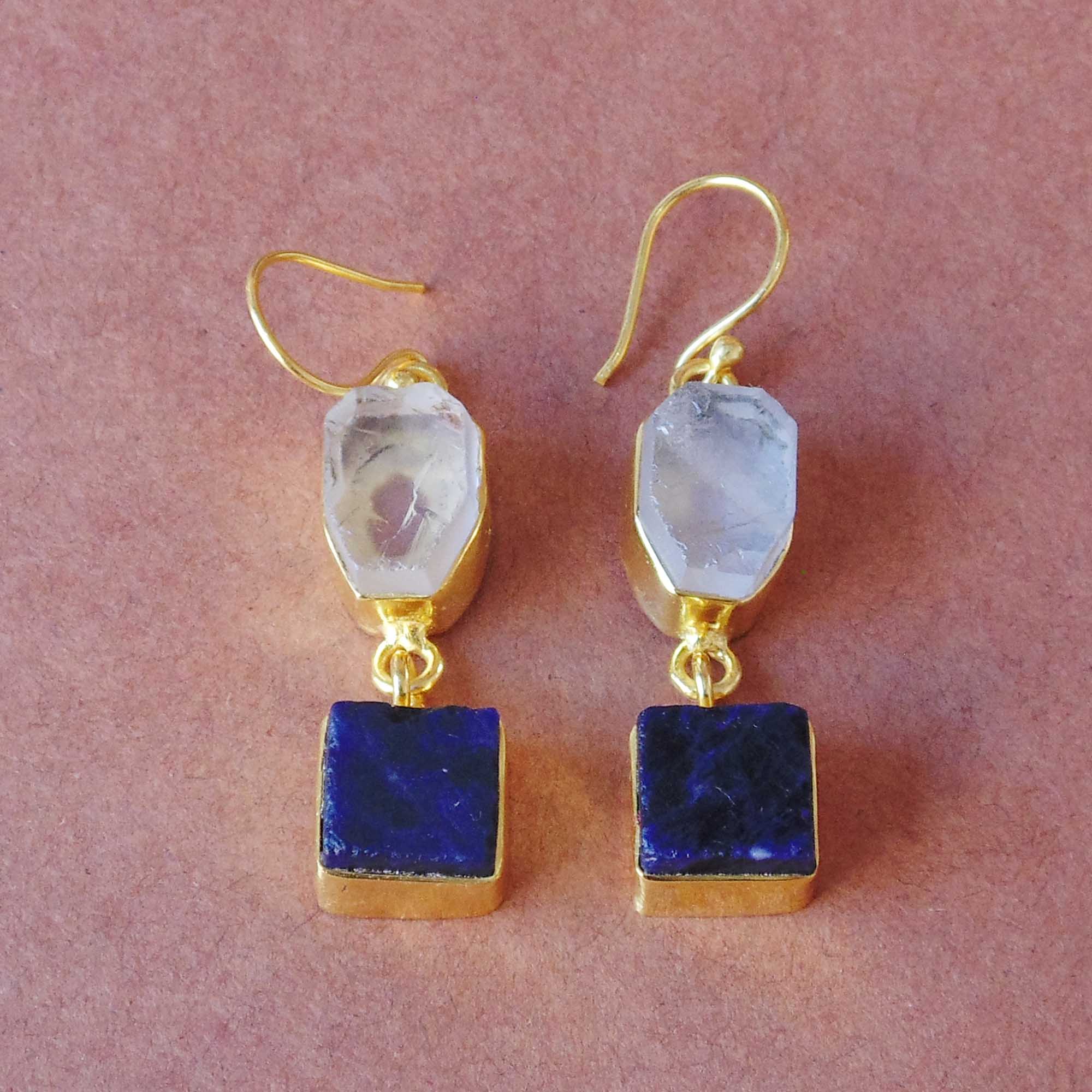 Ethereal and translucent, this beautiful natural two stone earrings is 18k gold plated brass with raw blue sapphire and crystal quartz. The bezel set dangle earrings are ideal for low key affairs.