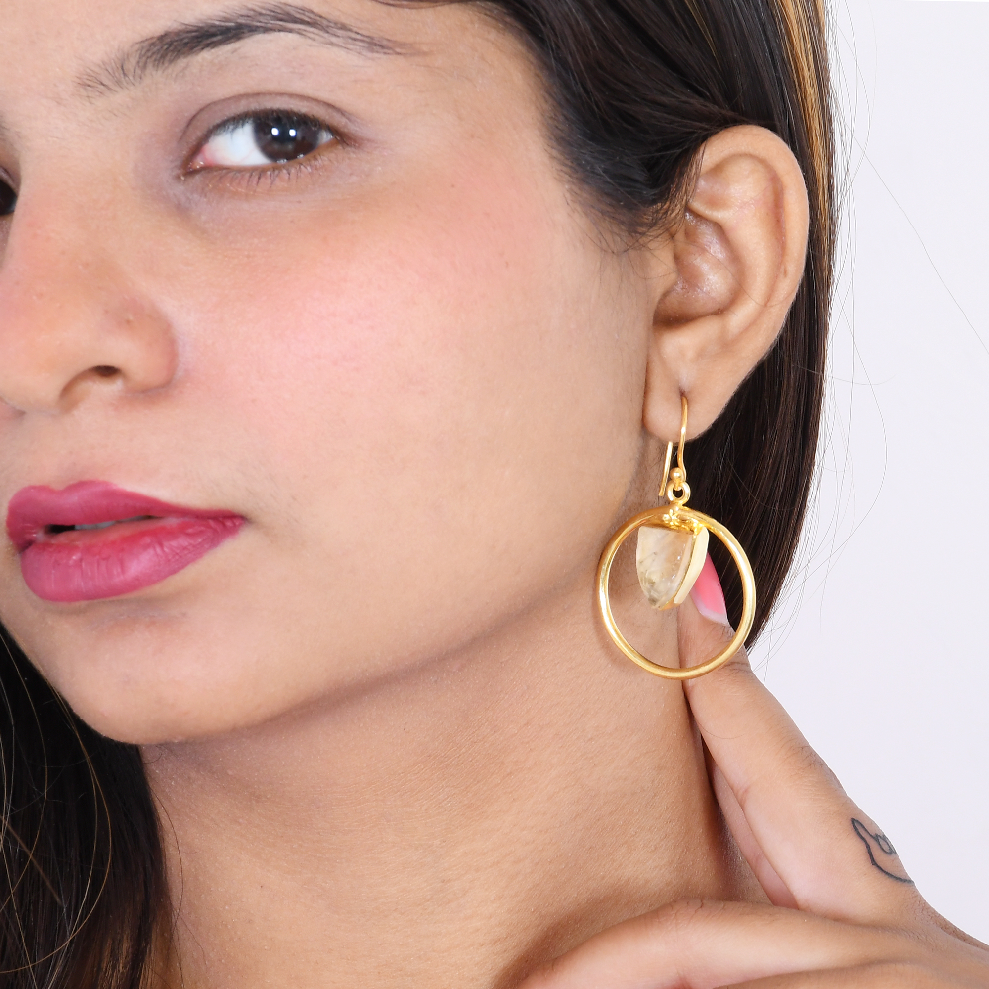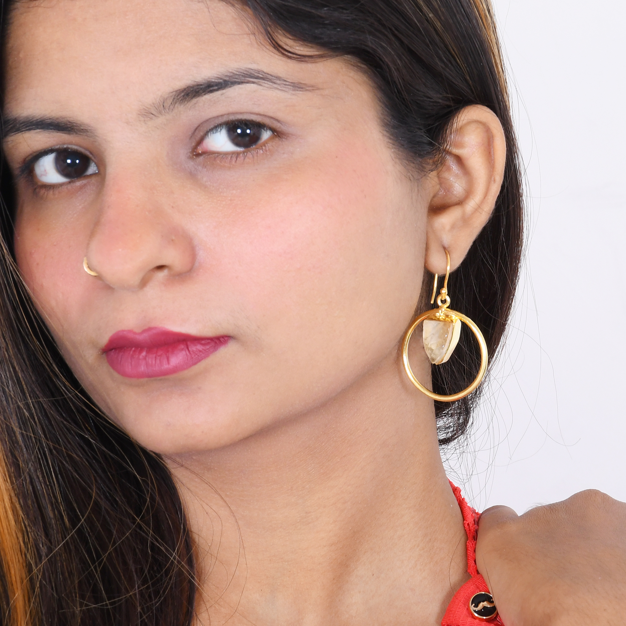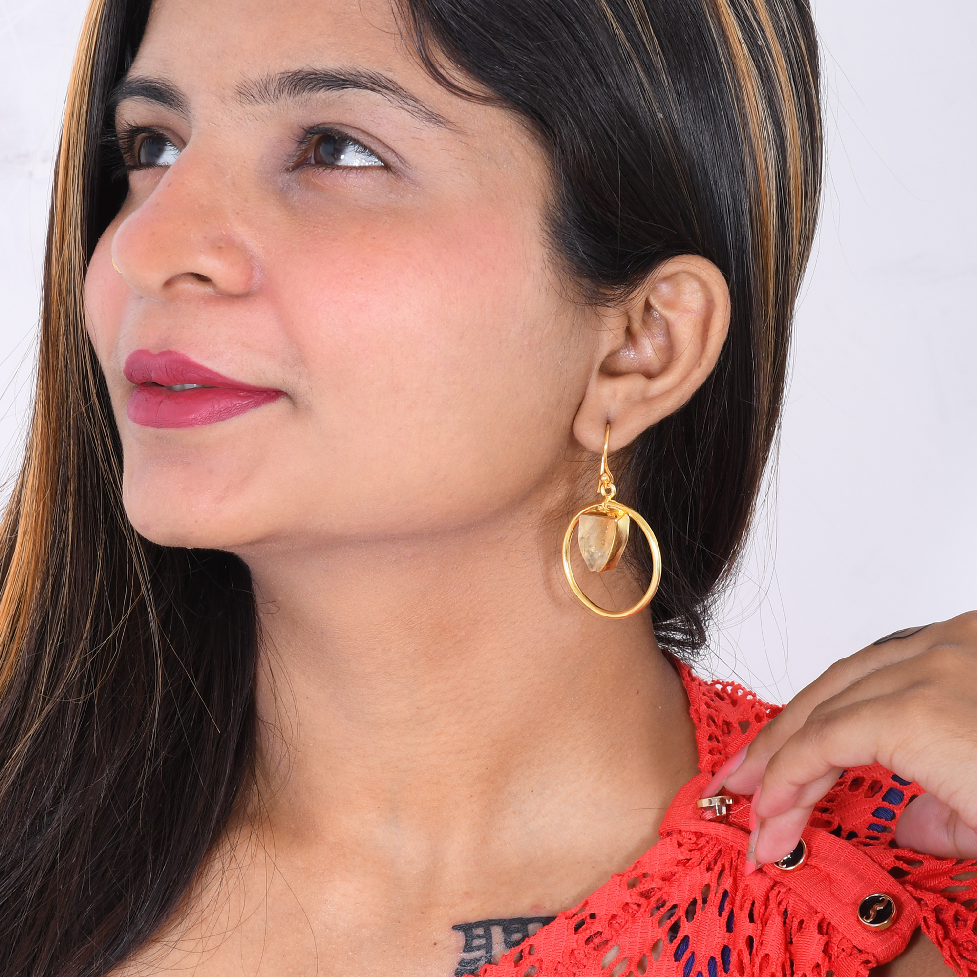 Handmade with love by Indian artisan Sunita Singh, I have created these chic elegant natural citrine earrings. The open circle is made from gold plated brass that draws attention to the honeyed tones of the raw gemstone. Lightweight and versatile they go effortlessly well with any occasion every day. An ideal choice for the modern woman.