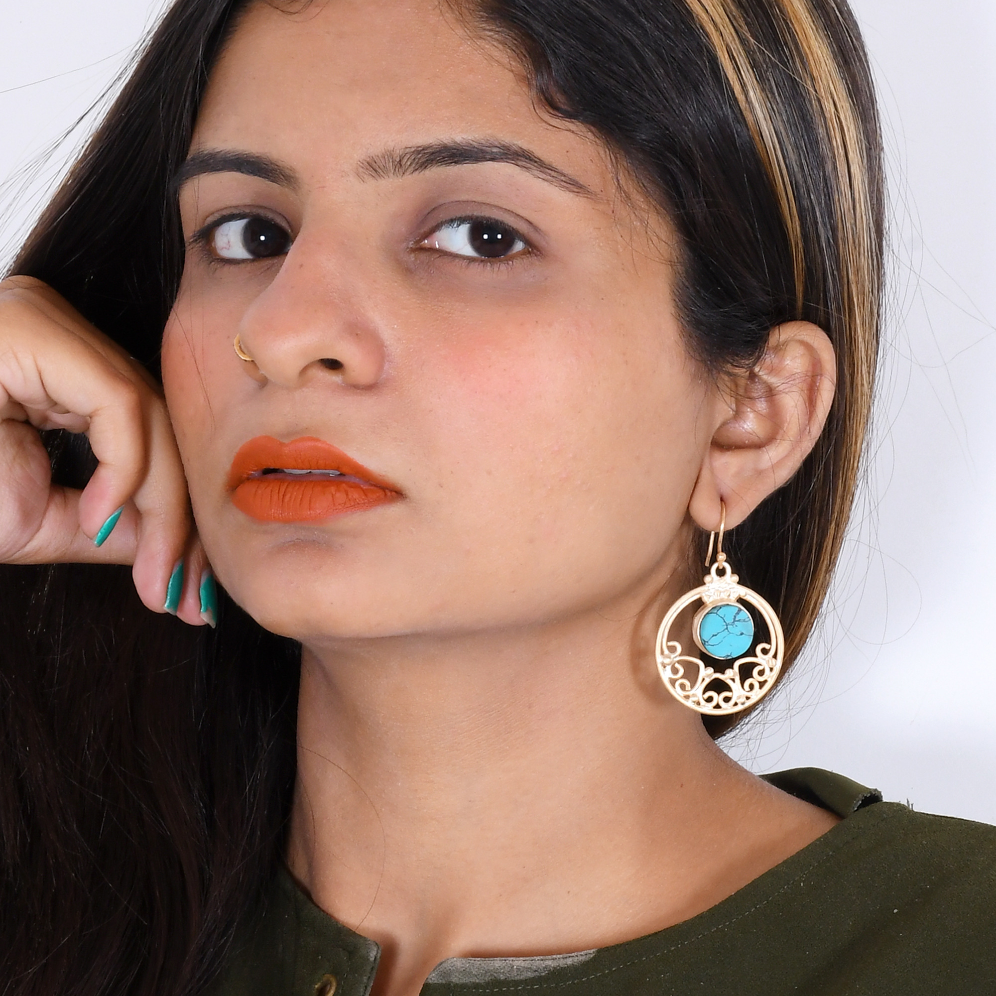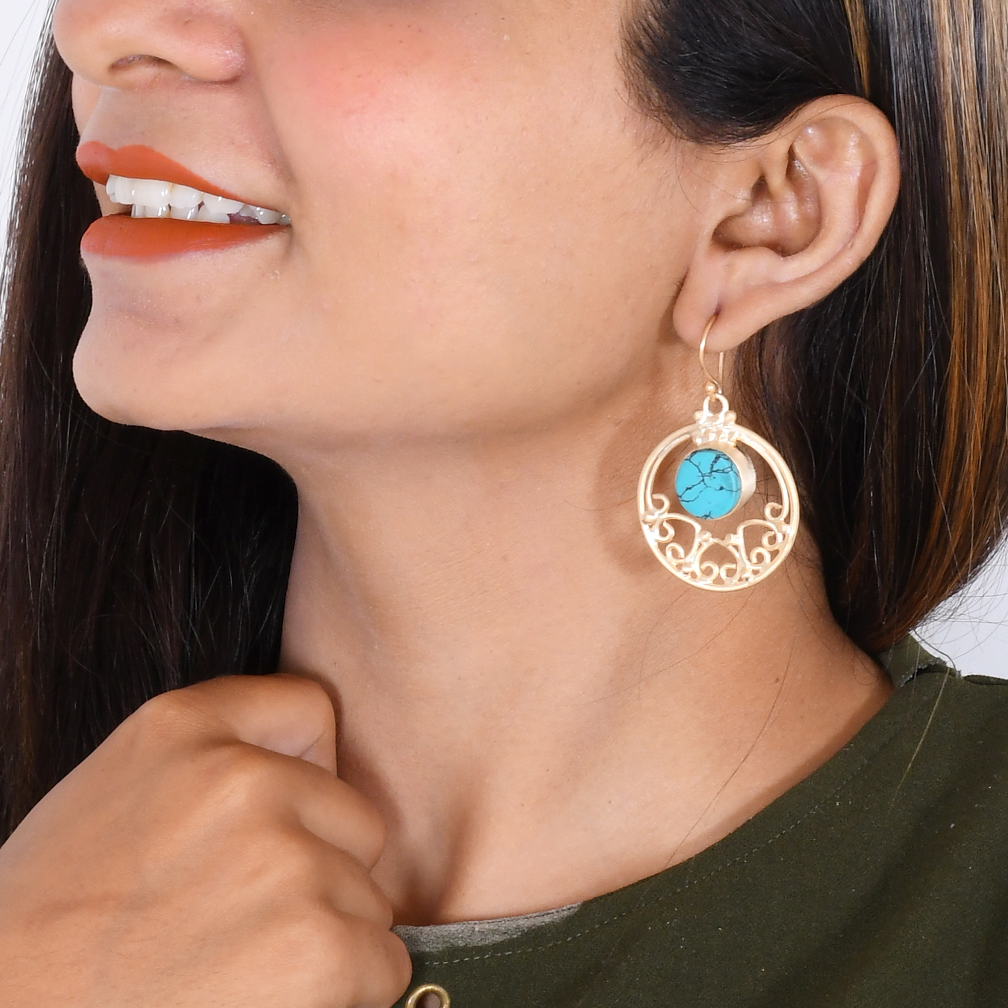 Handmade Round Circle Shape Green Turquoise Gemstone Metalwork Earrings