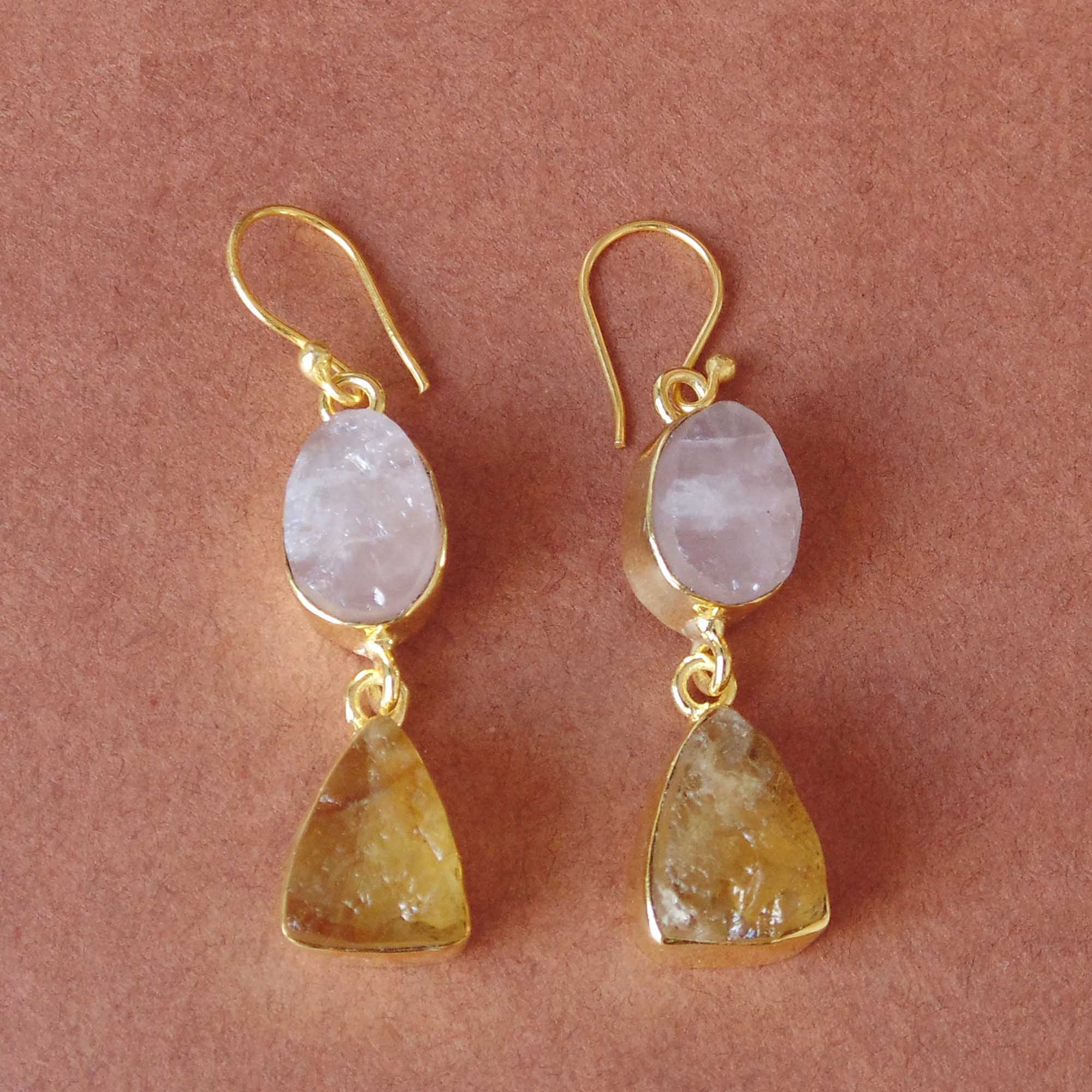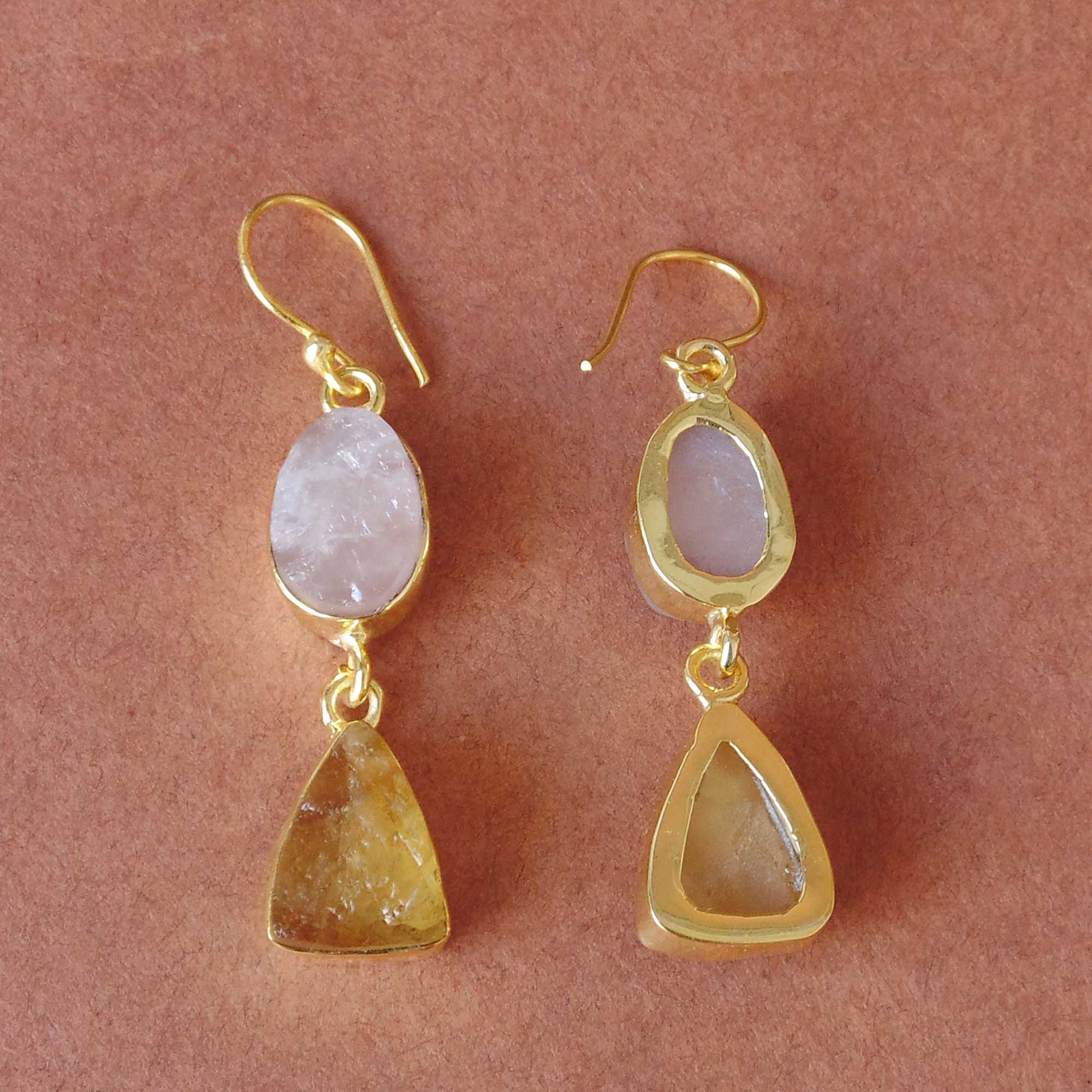 Sophisticated and charming this rose quartz and raw citrine dangle earrings are embodiment of new beginnings. The wonderful hue of the natural stones complements each other in its gold plated setting. Perfect minimalist dangle earrings that is suitable for any occasion.