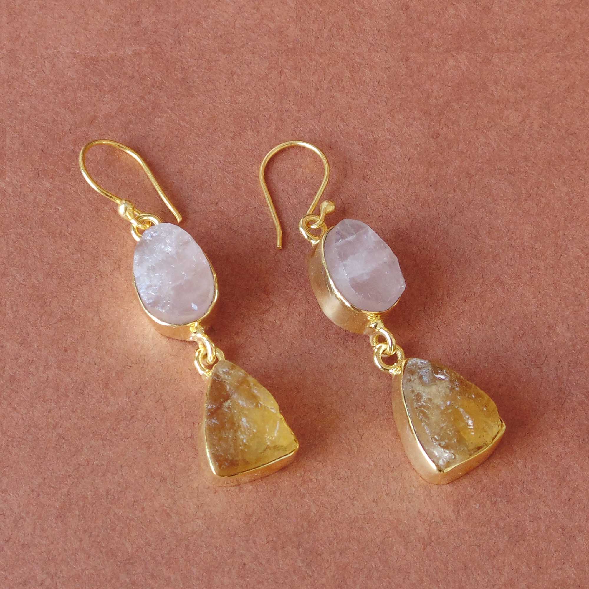 Wonderful Rose Quartz And Citrine Two Stone Long Dangle Earrings