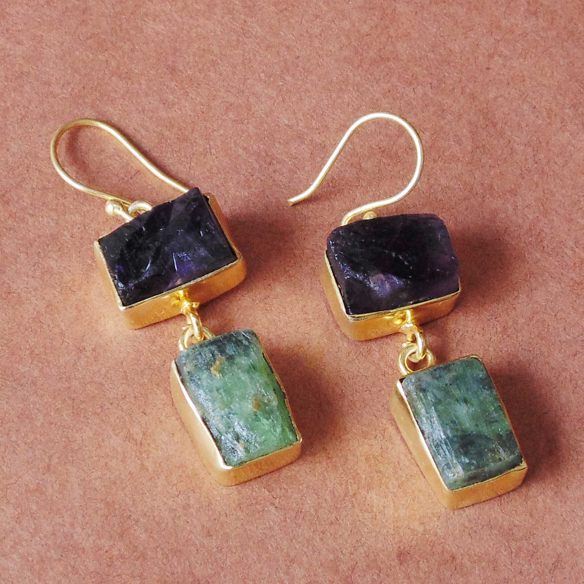 Simple and Elegant! These bezel set dangle earrings feature natural purple amethyst and green kyanite gemstone made in 18k yellow gold plated over brass. This beautiful pair of earring has been handcrafted by artisan (Sunita Singh) in Jaipur, India.
