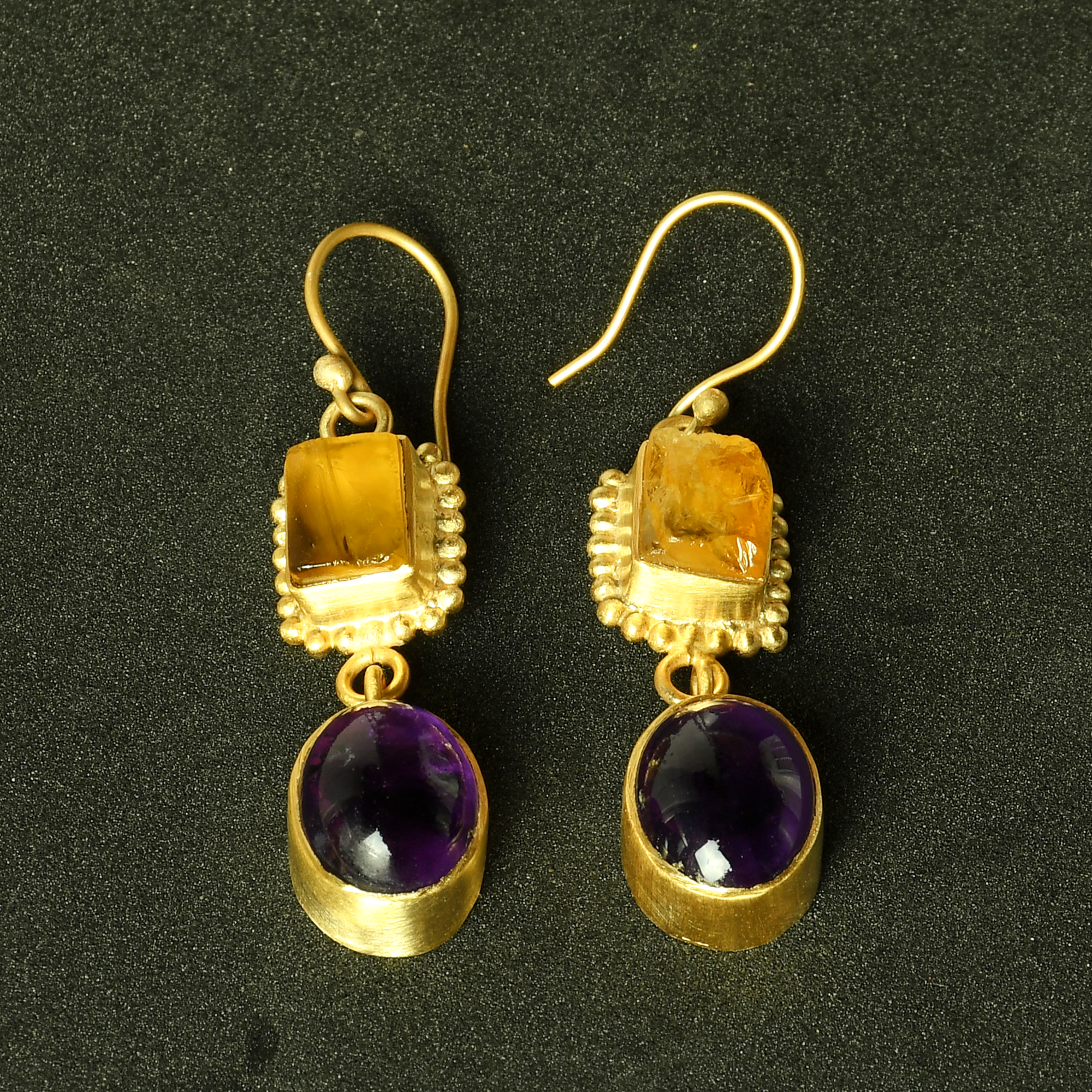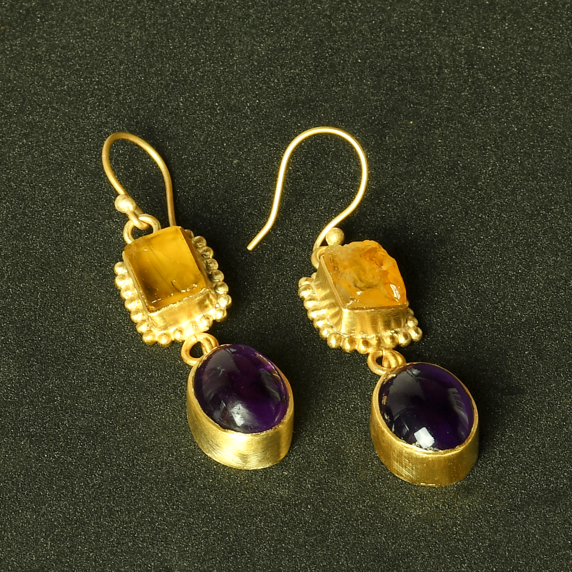 Made with a touch of decadence our artisans have crafted this gorgeous earring. We have used natural yellow citrine and rich purple amethyst that complements each other. All the metal detailing is made using gold plated brass and created for an antique finish. Made with love for the bride who want something that carries the old world charm and yet fits perfectly with their contemporary wardrobe. All our designs are authentic and made for the independent soul.
