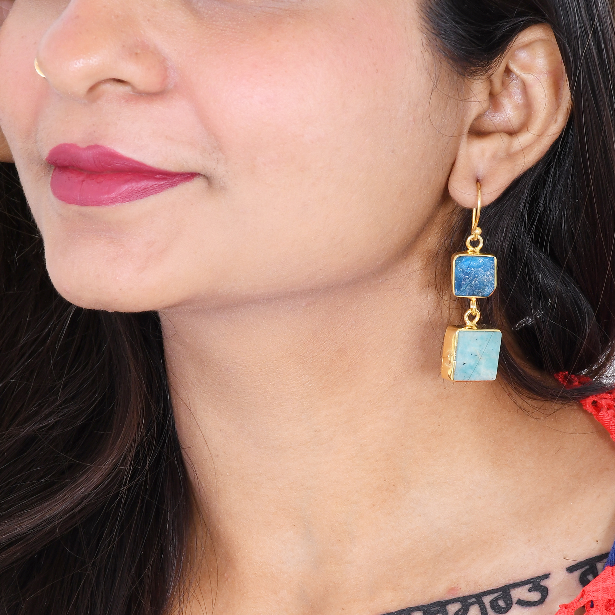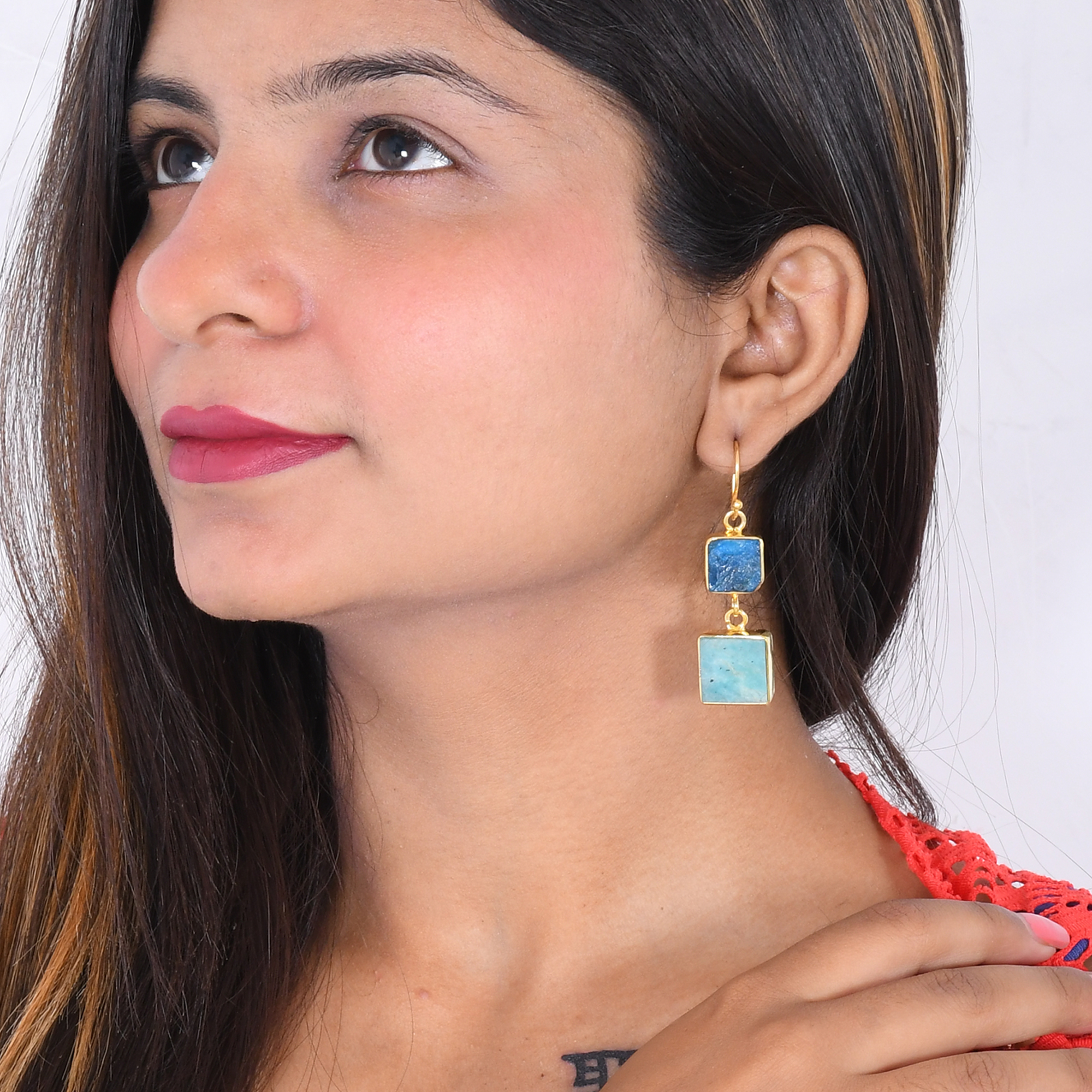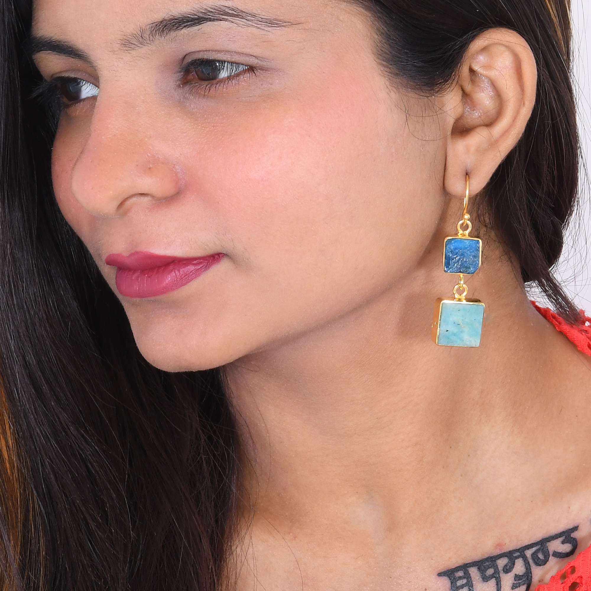 We love our creations to reflect the natural beauty of the gemstones. For this design, we have used raw apatite and amazonite gemstones. The simple 18k gold-plated brass metal detailing brings out the stunning texture and color of the gemstones. This dual gemstone earrings are stylish as well as lightweight, ideal as a gift for a loved one.