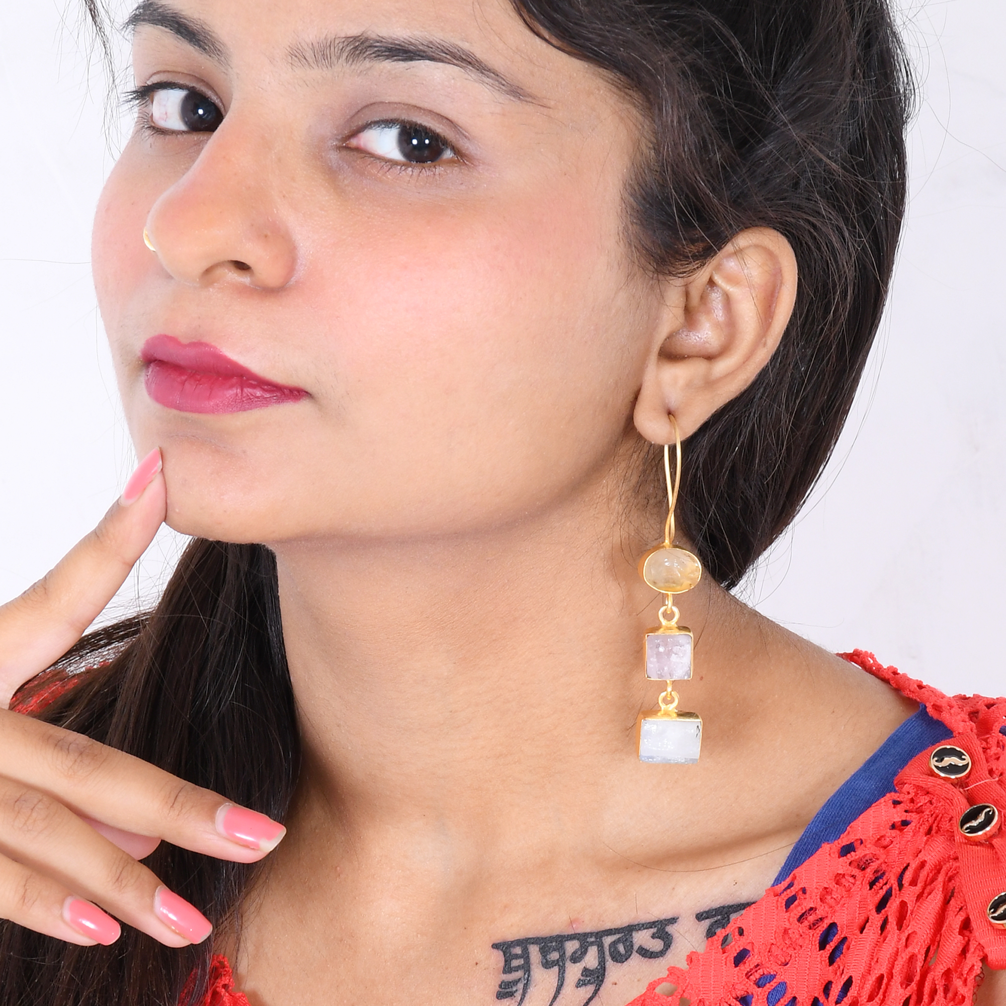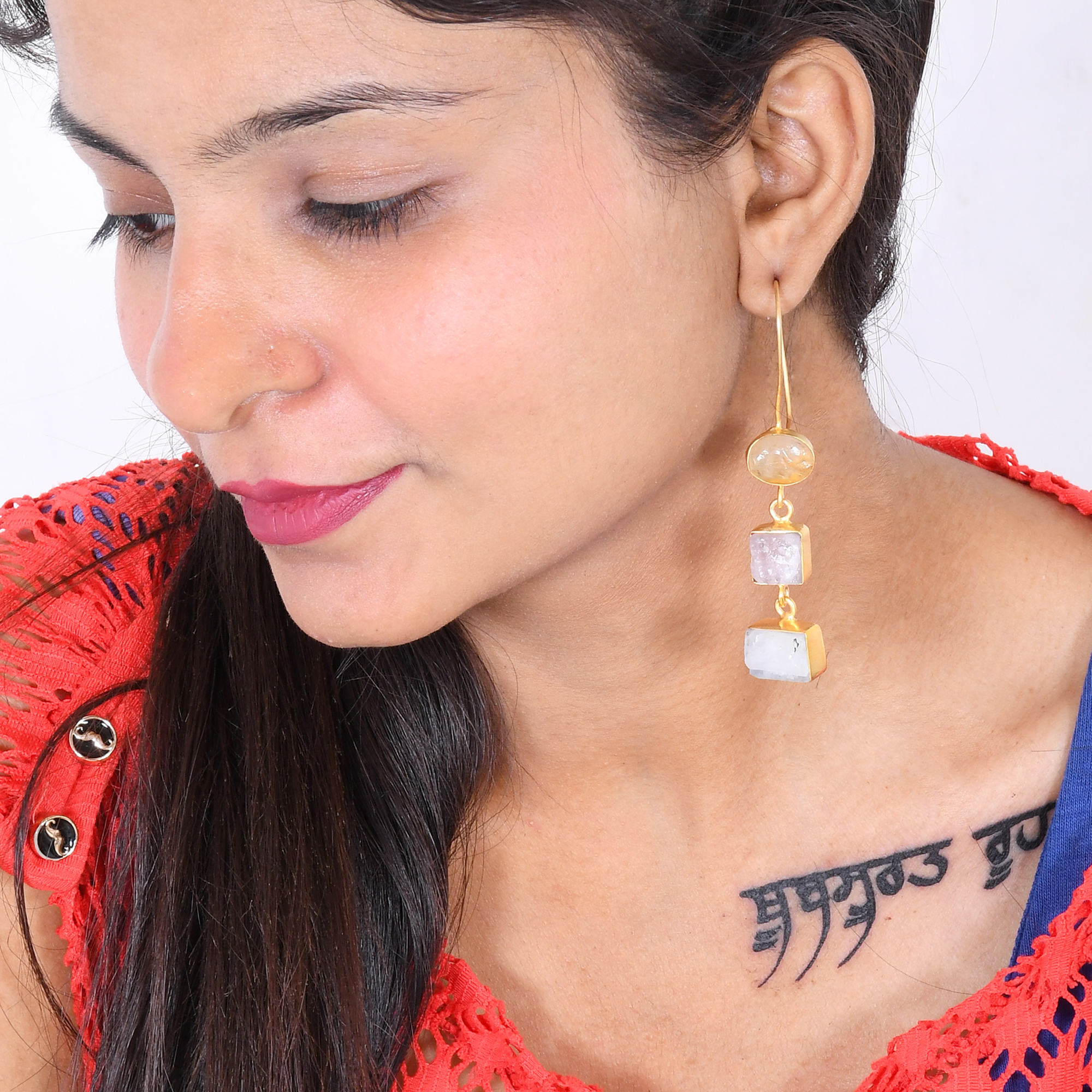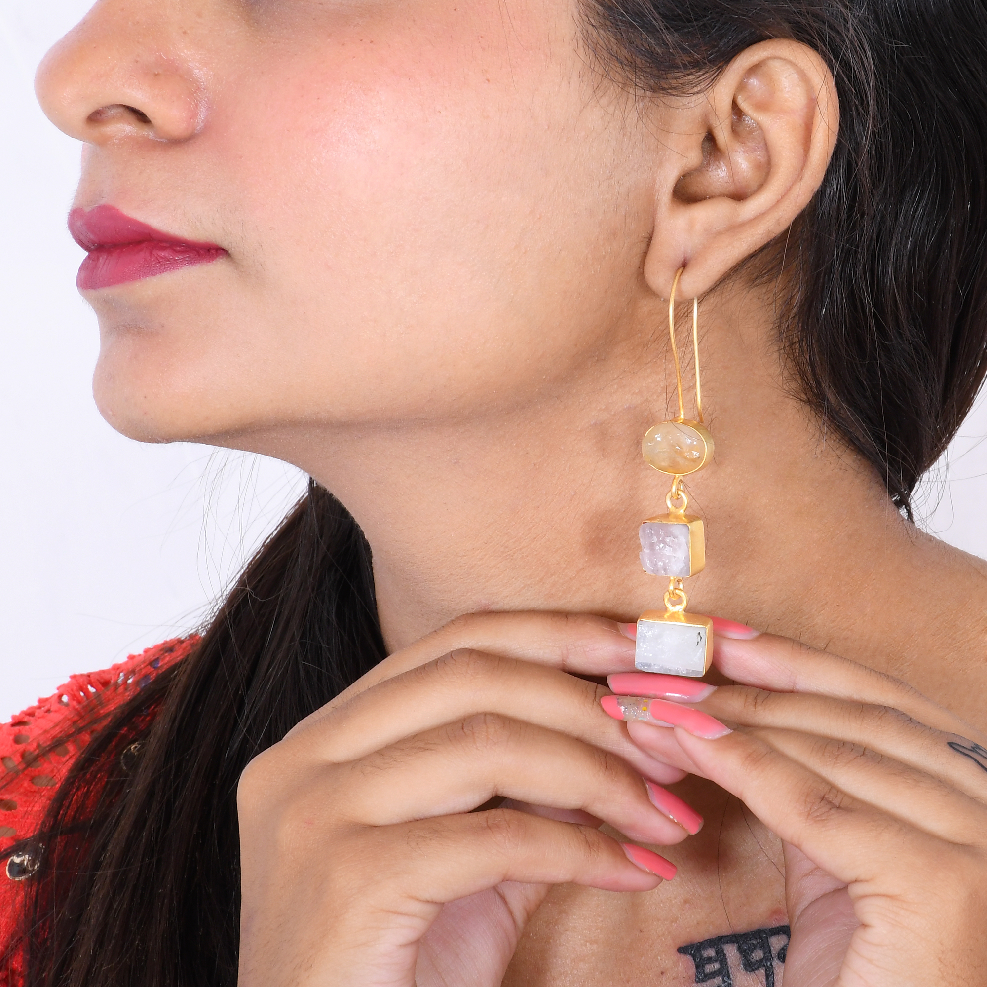 Handmade with love for the stylish woman; we have created this dangle earring design. Composed of yellow citrine and rose quartz we have retained the natural raw form of the gemstones to create texture and character. The brass detailing is kept delicate to allow movement in the design. Affordable and lightweight it is perfect to wear throughout the day.