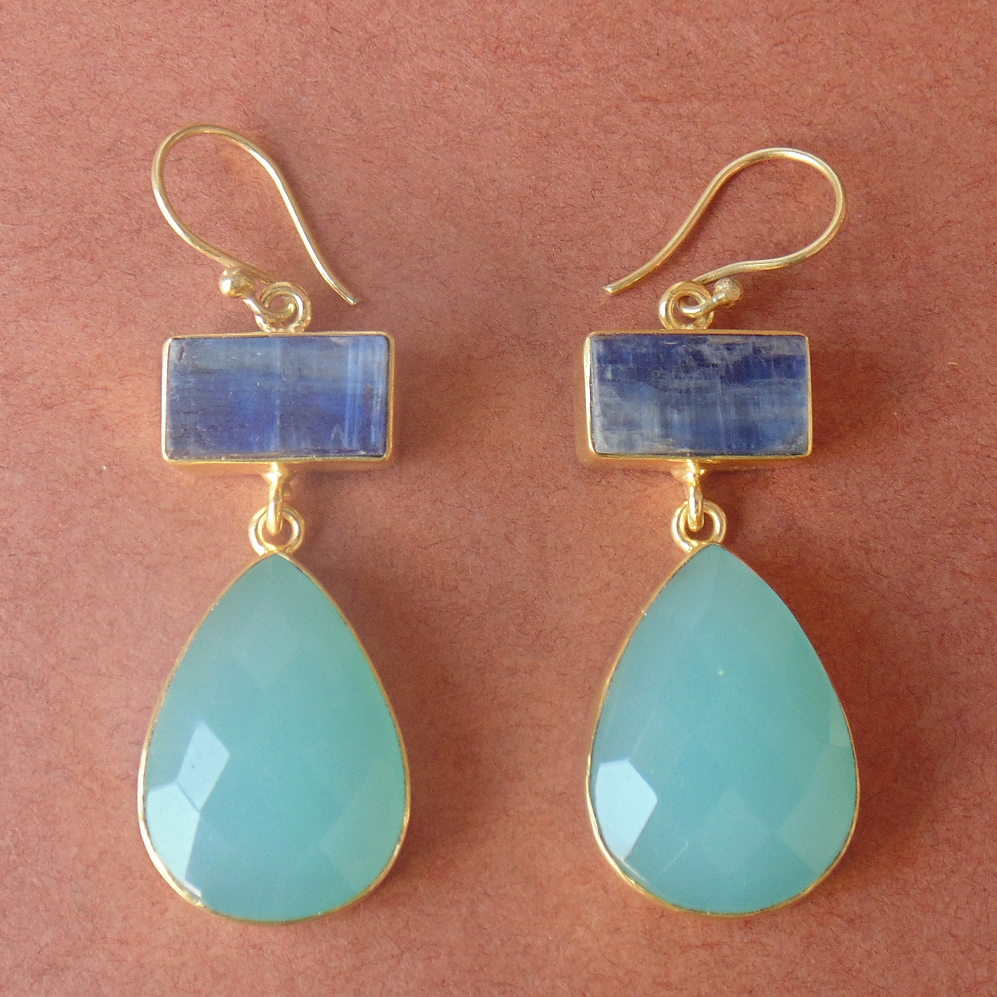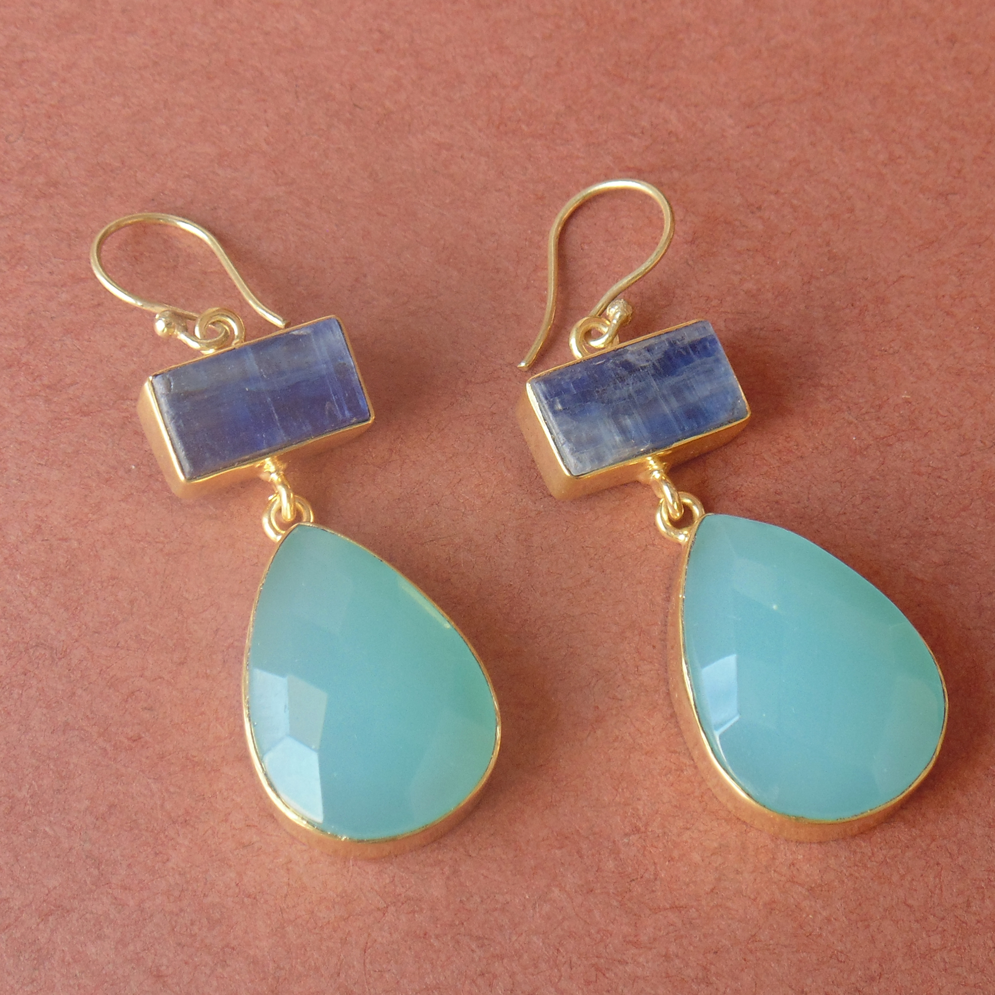 Handmade Aqua Chalcedony And Blue Kyanite Birthstone Teardrop Earrings