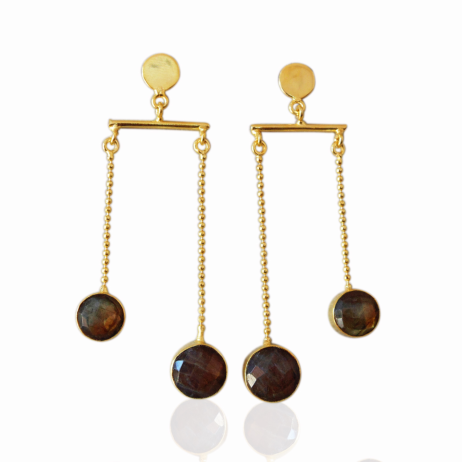 We enjoy creating modern jewellery pieces that resonates with you. Handmade in high quality brass these 18k gold pated dainty earrings have inspired by movement. We have used two natural faceted labradorite gemstones in our design with very delicate metal detailing that highlights the features of the gemstones. These dangle earrings are lightweight and very affordable.