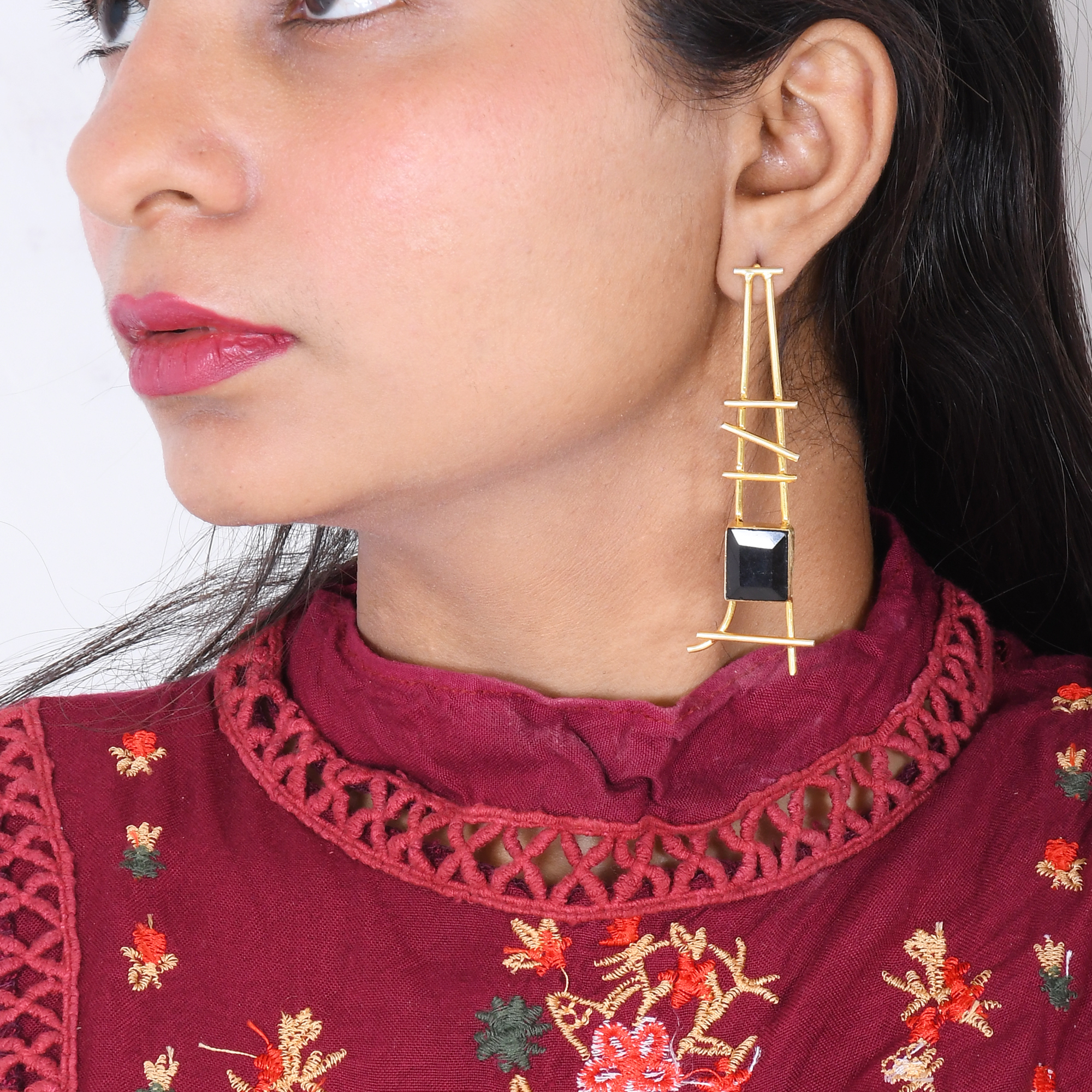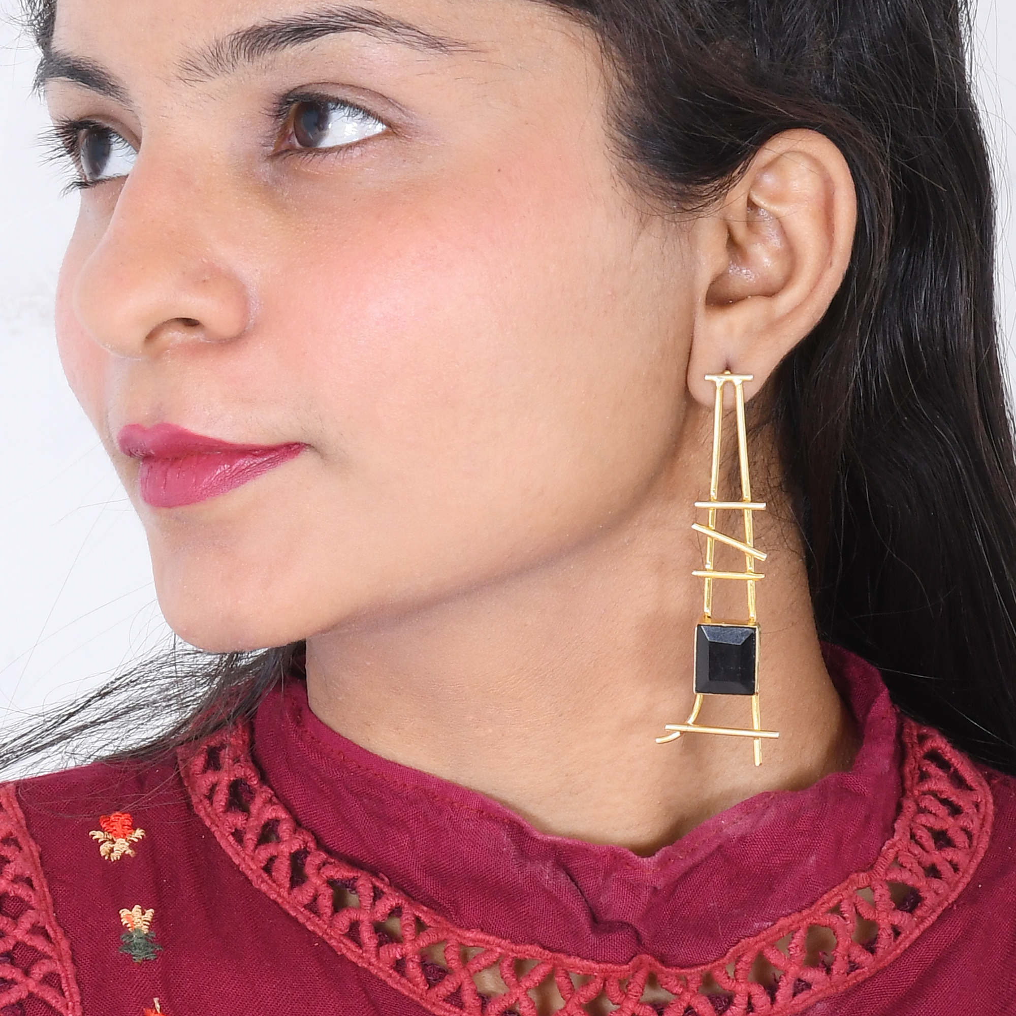 Geometric Design, these 18k gold plated brass and faceted black onyx gemstone post dangle earrings bring eye-catching motion, color, and artistic appeal to your jewelry collection.
