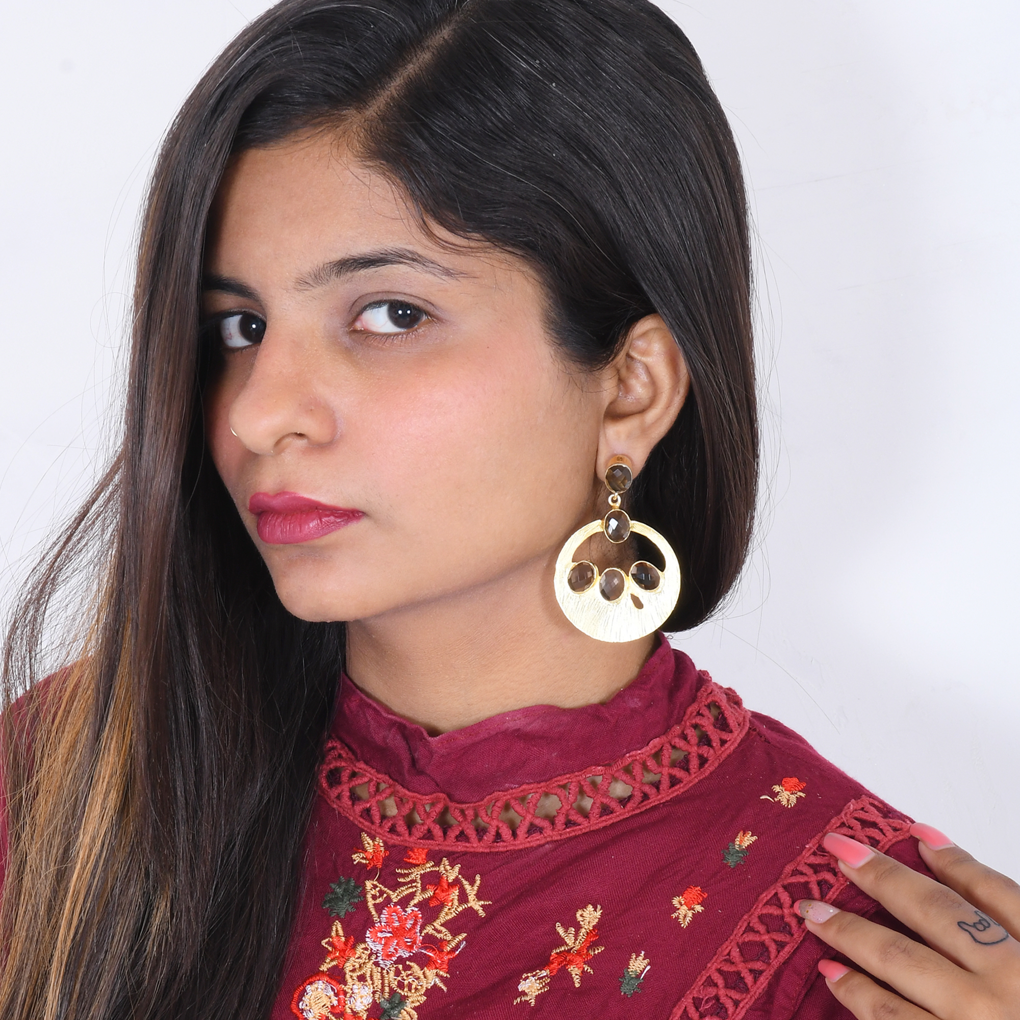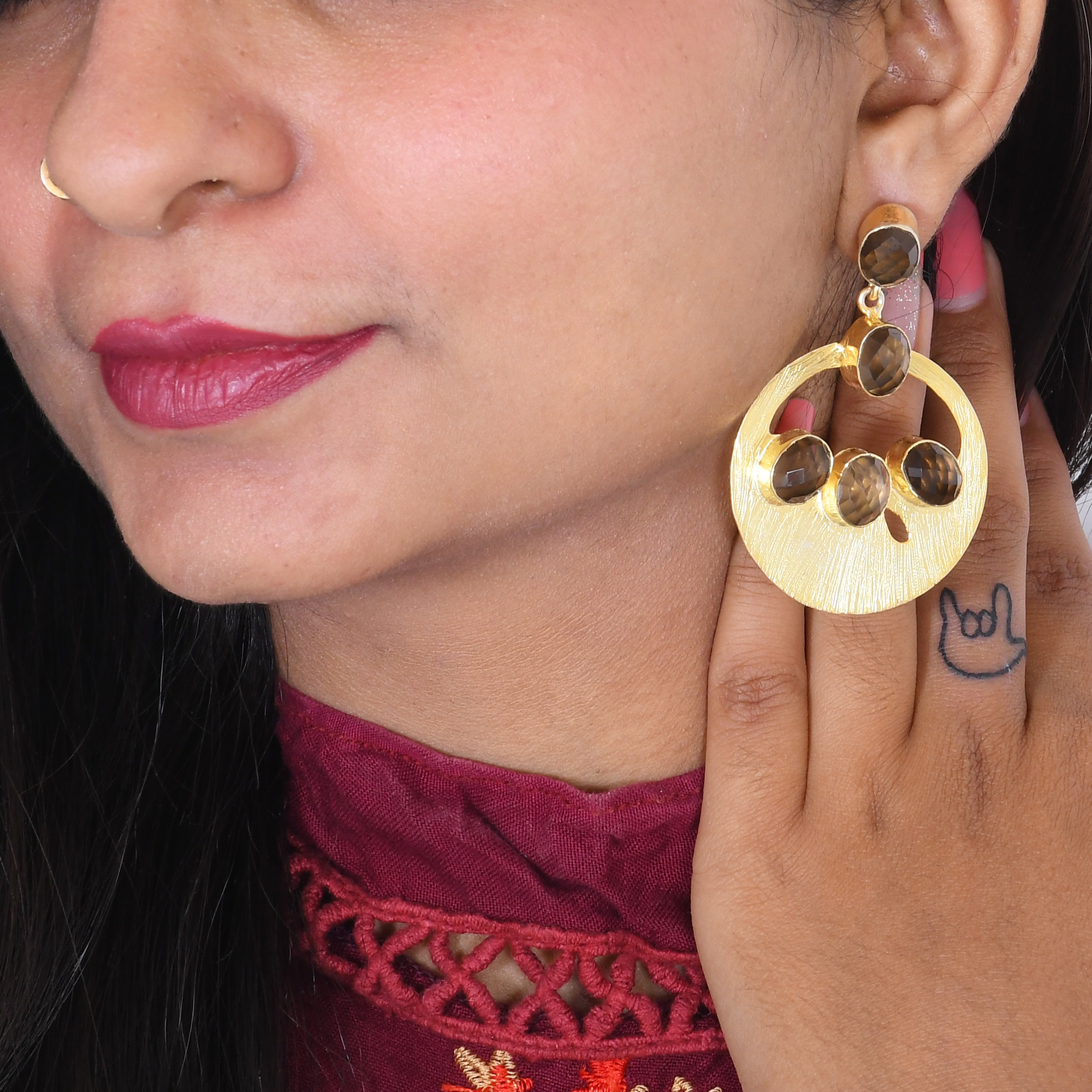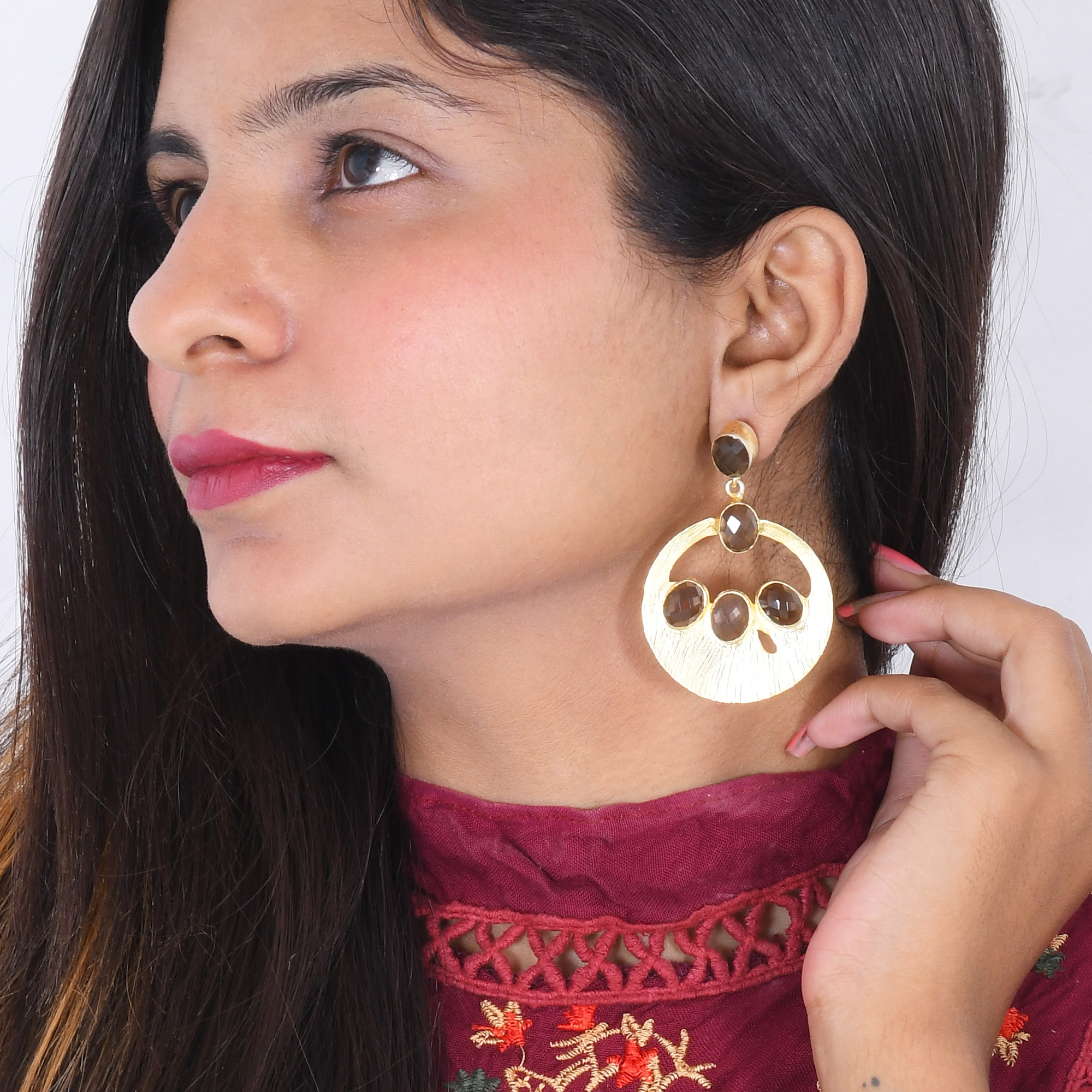 These earrings are one-of-a kind, handmade in solid brass and plated in 18k yellow gold and be jeweled with smoky quartz stone make for a fashionable post dangle earrings.