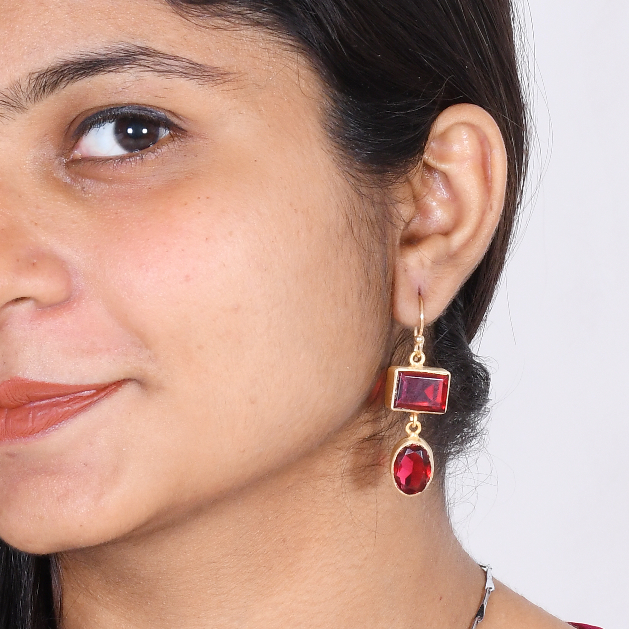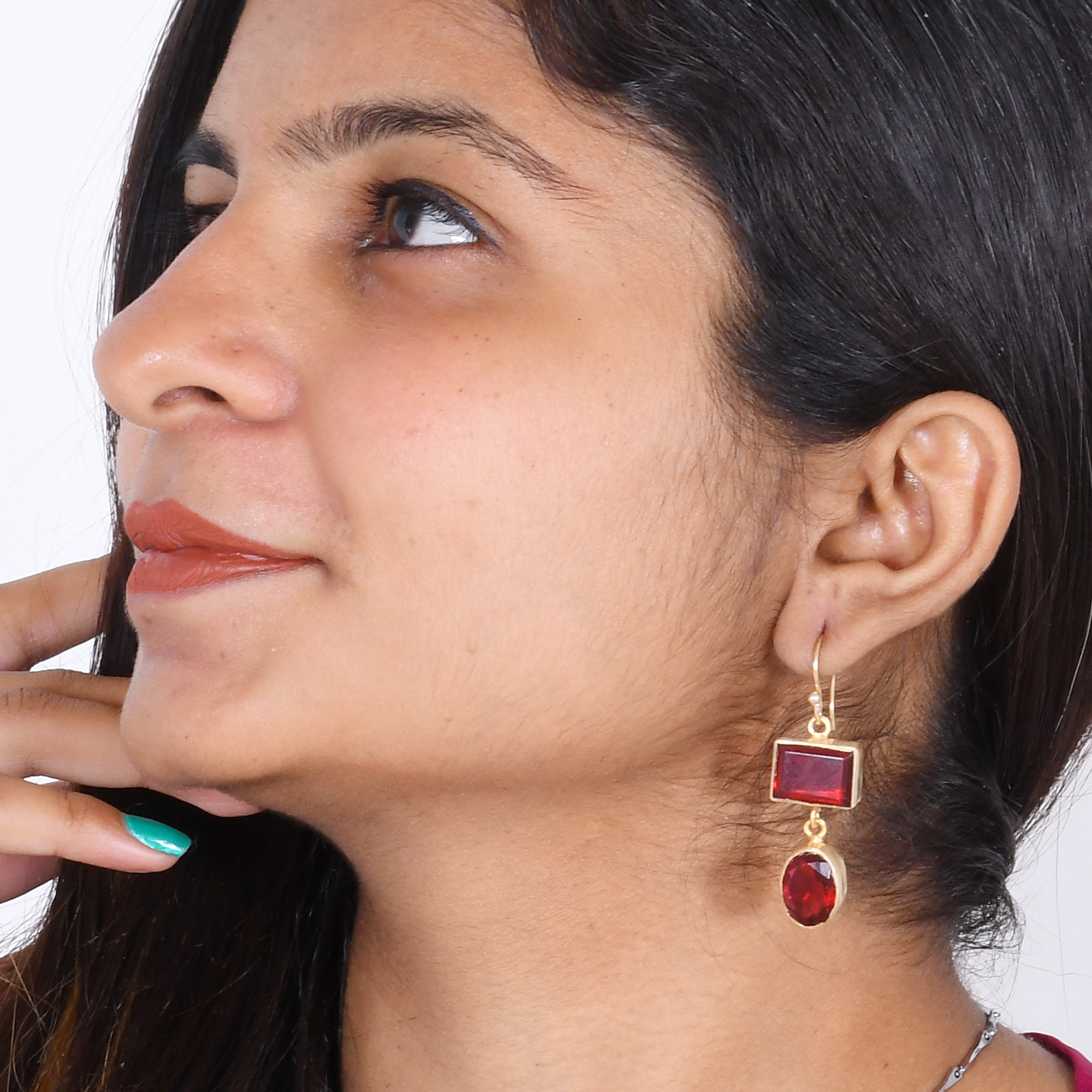 The classic combination of red stone and gold spells high fashion. Handmade by our skilled artisans these earrings are made with a lot of care. Crafted flawlessly using high-quality gold plated brass and dangle earrings are the perfect way to style an evening ensemble. Lightweight and affordable they make a great gift.