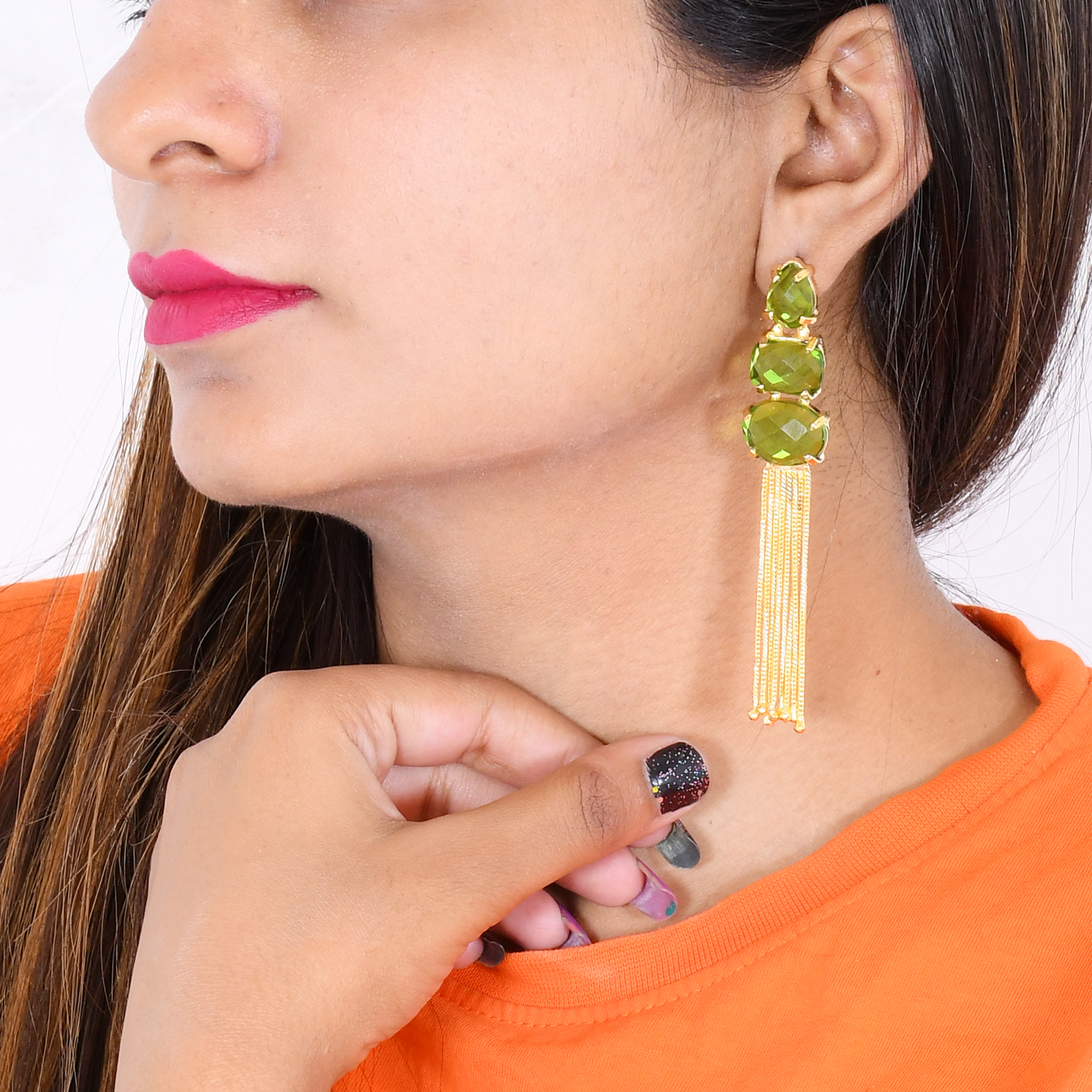 Gift the bride a shade of nature with this designer dangle earrings made in brass . Earthy and stunning, this chain gold plated earrings is set off brilliantly the green peridot quartz making it a sight to behold, much like the bride to be one her special day.