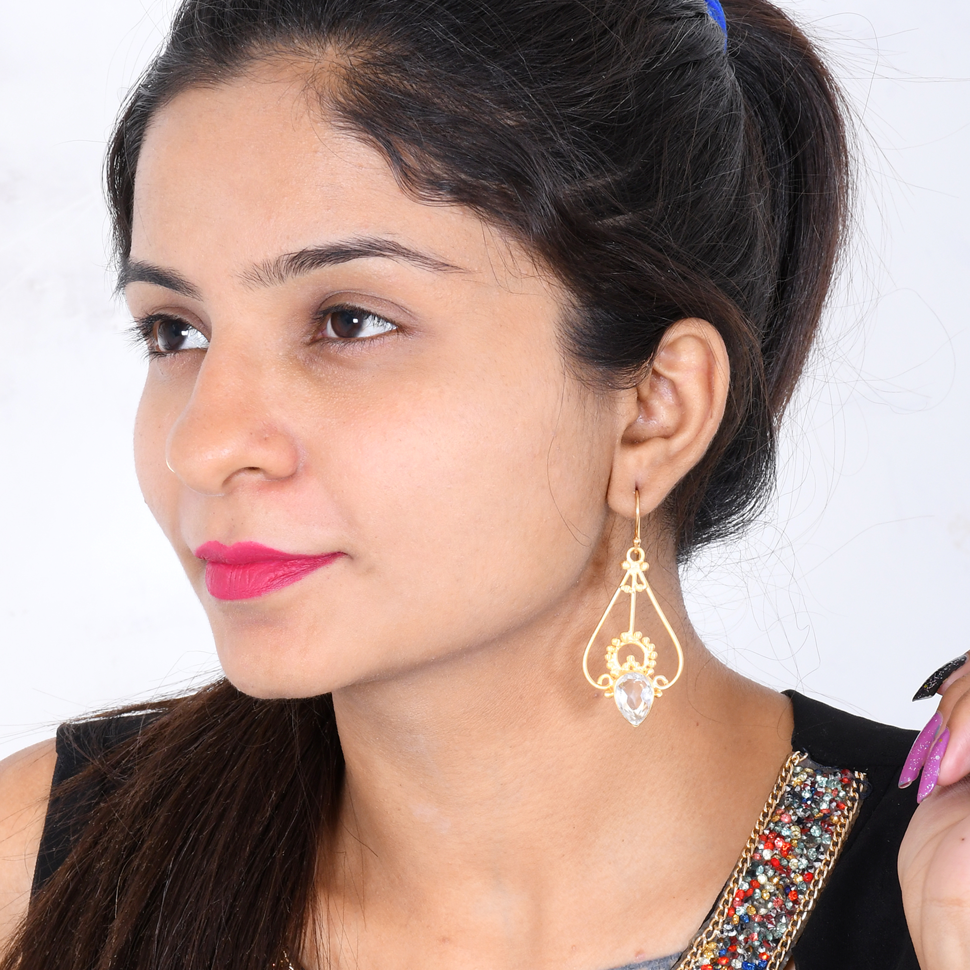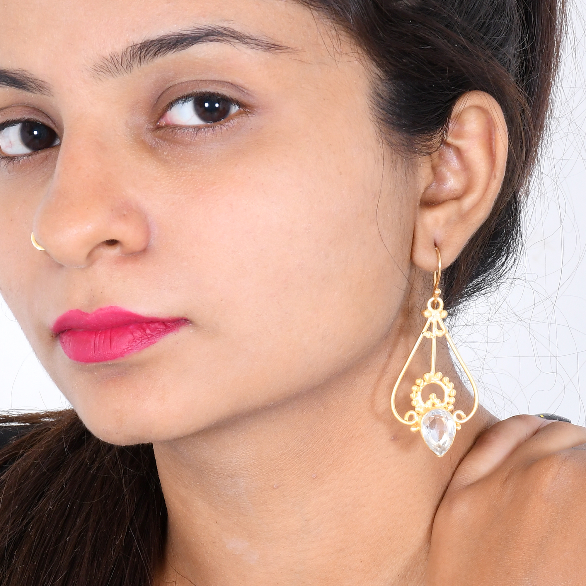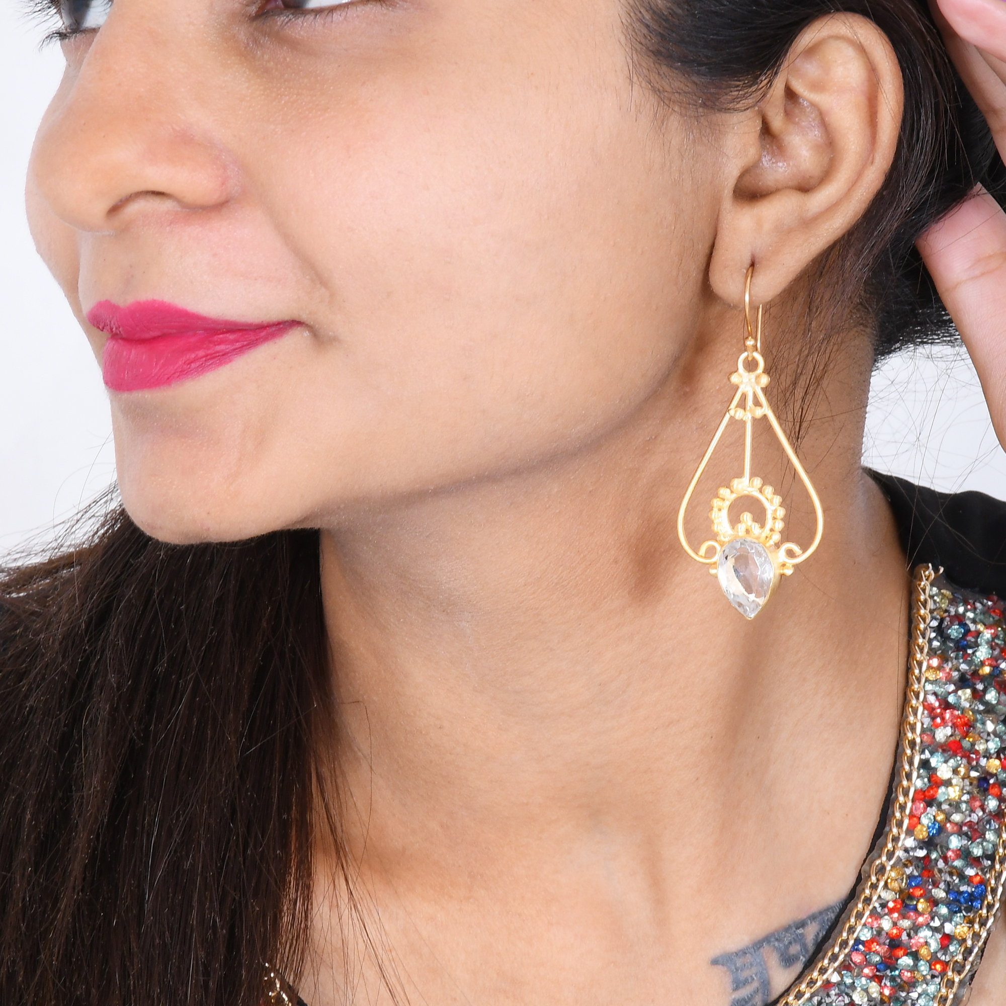 Unique designer earrings that have been carefully handcrafted by local artisans. The crystal quartz shimmers beguilingly in the bezel setting. We have used high-quality gold plated brass that is hypoallergenic and resistant to corrosion. Stunning unique design of the earring is simply fantastic and will remain in style for years to come.