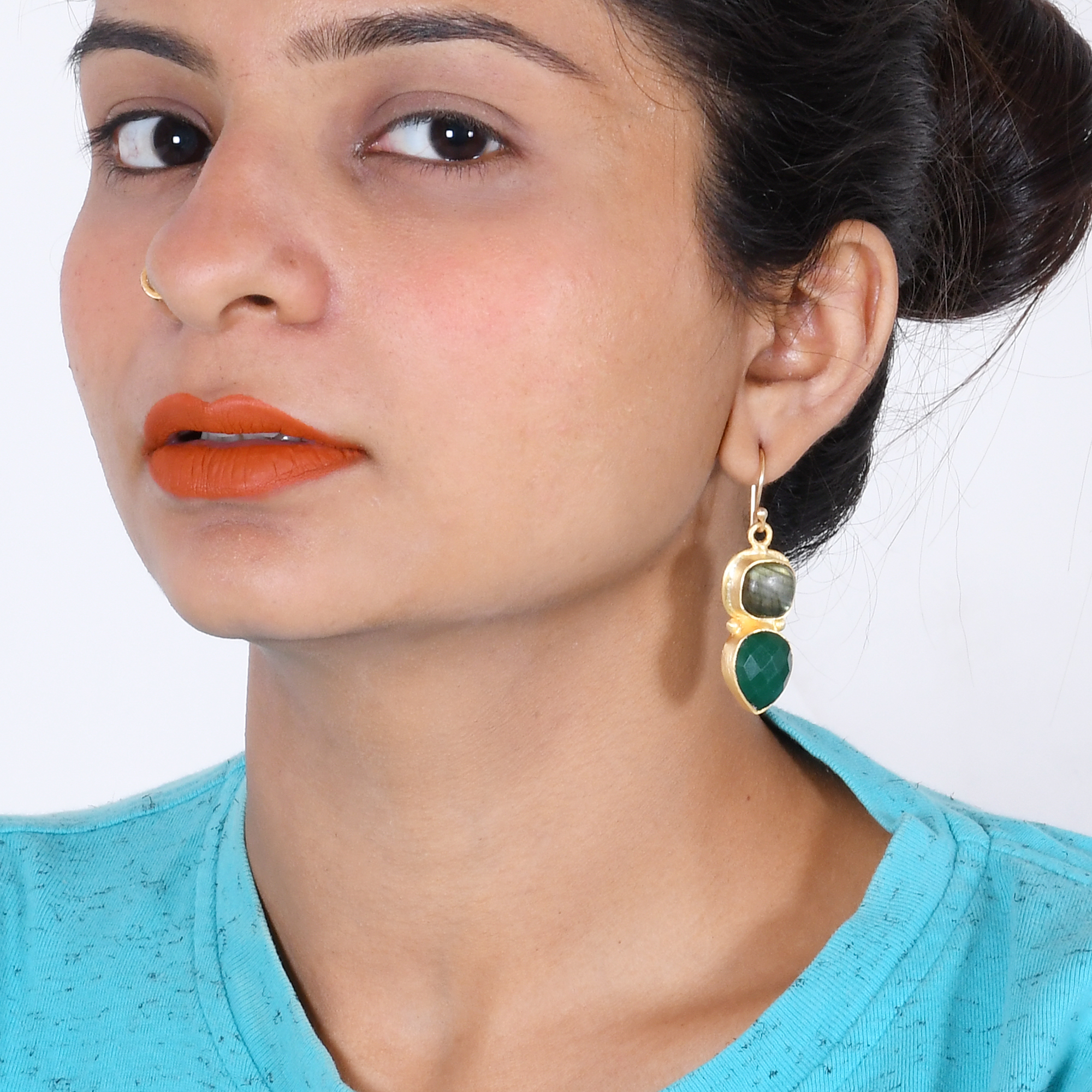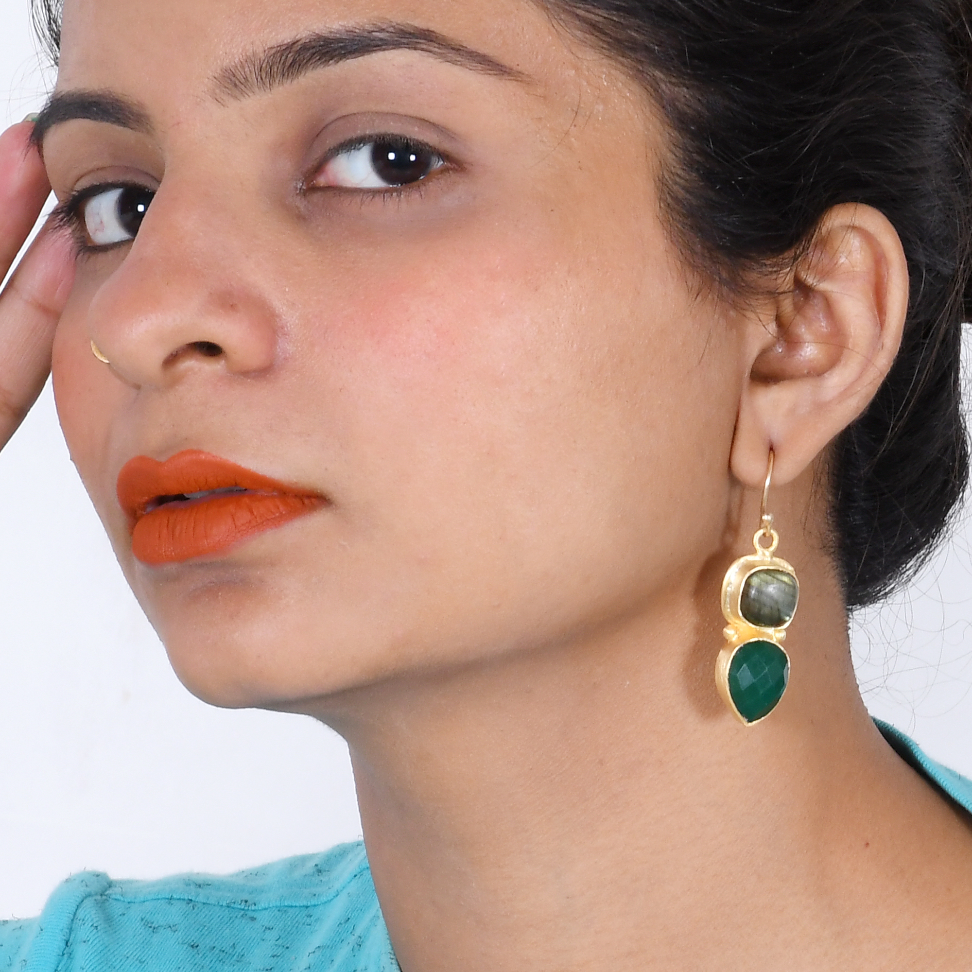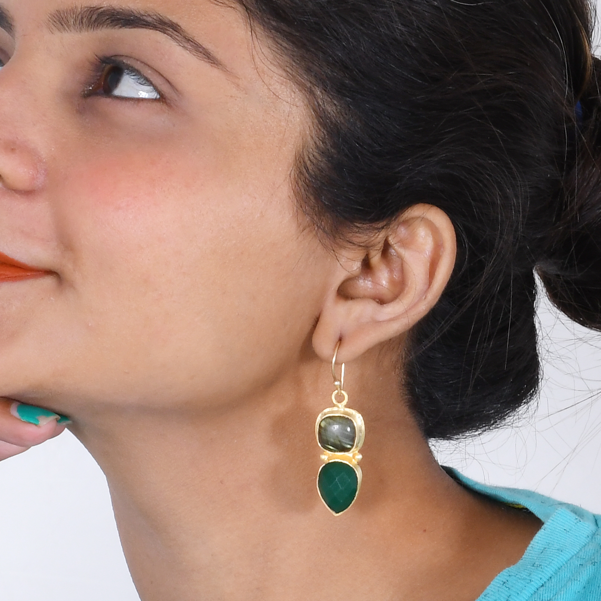 Redefine elegance with these timeless natural labradorite and green onyx earrings. Bold and chunky two gemstones are encrusted in 18k gold plated brass earrings. The delicate hook allows movement and it is comfortable to be worn all day long.