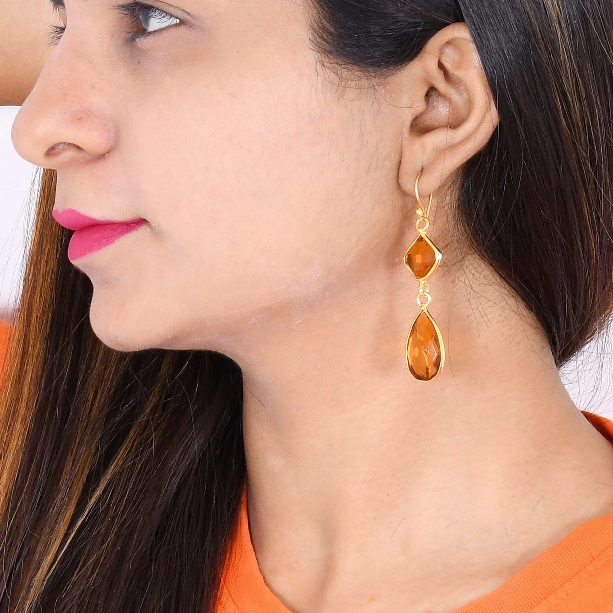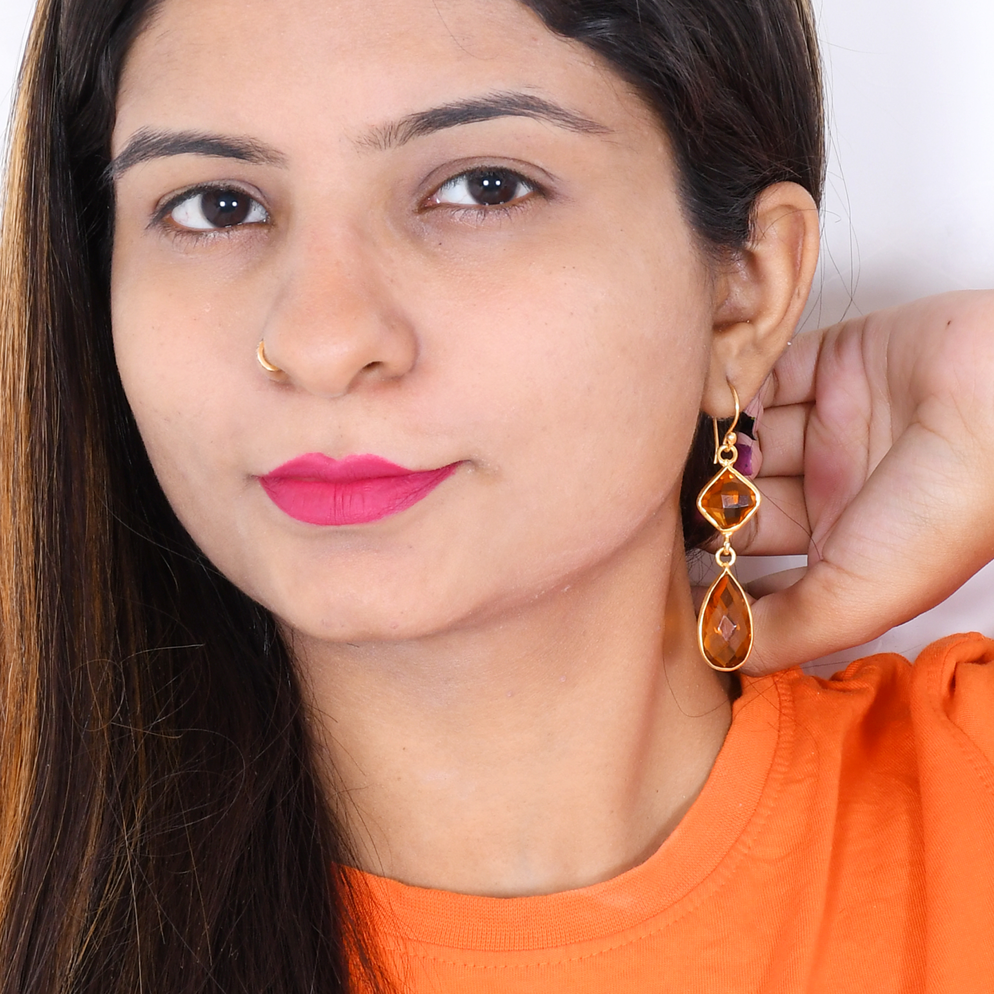 A pop of yellow synthetic citrine makes these bezel set dangling earrings a stunning choice for any day. This is a handcrafted in brass metal.