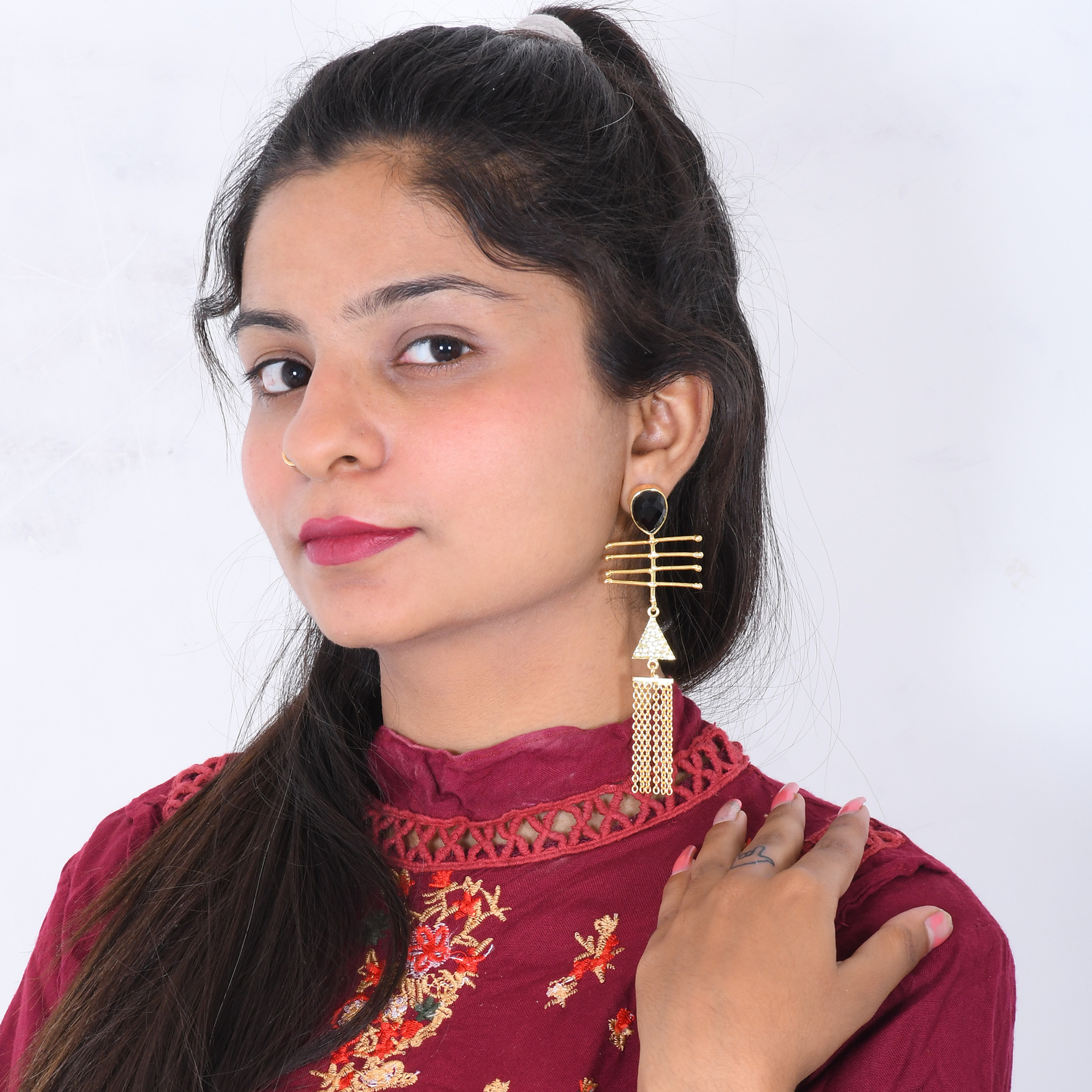 Unique character of the long line earrings is captivating. Make a statement with this black Onyx gemstone earrings. The 18k gold enhances the dangle earrings and is a perfect party accessory.