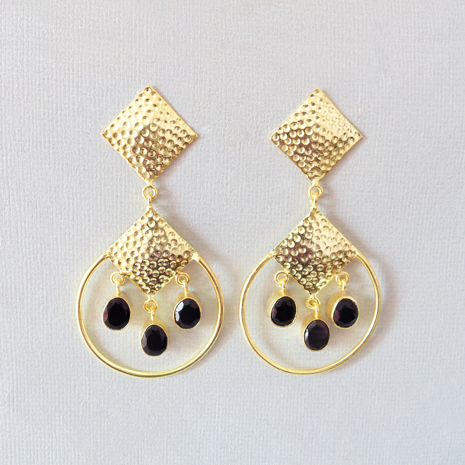 Hammered 18K Gold Plated Black Onyx Gemstone Chandelier Earrings