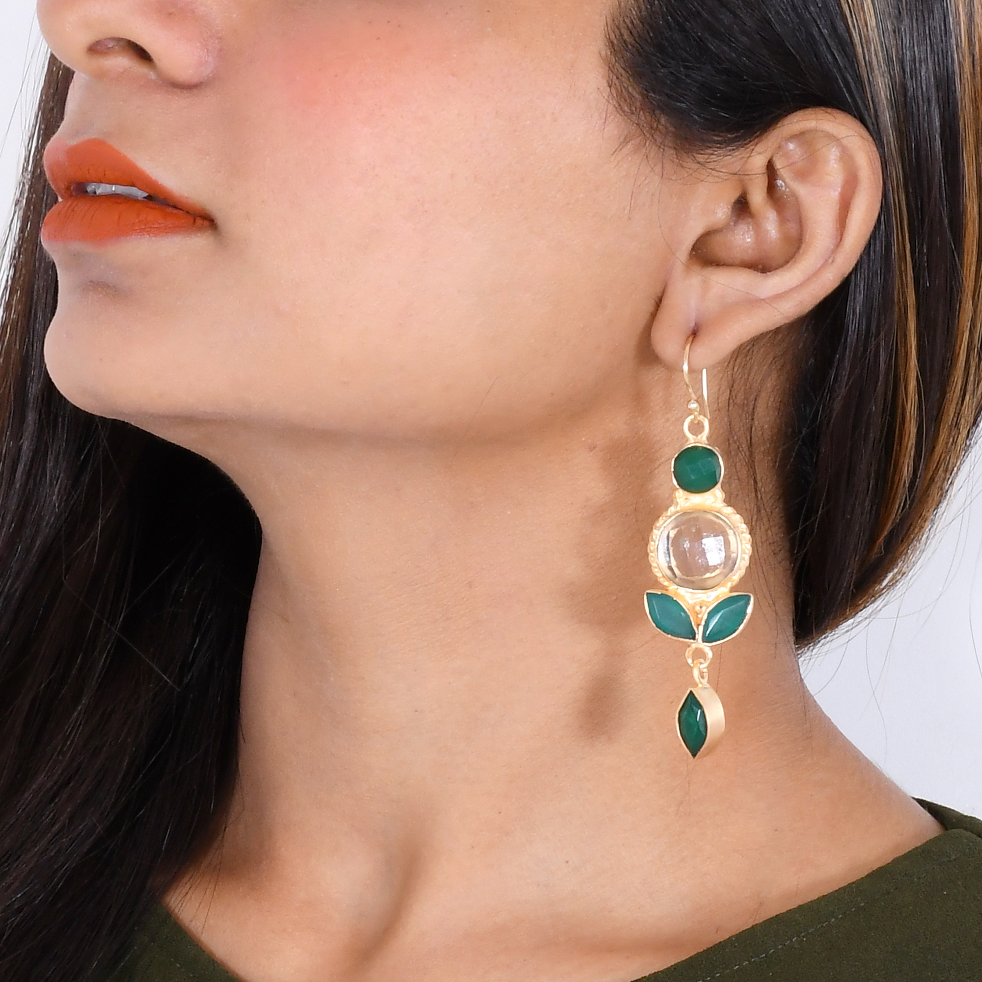 Crystal Quartz And Green Onyx Gemstone Dangle Earrings For Women