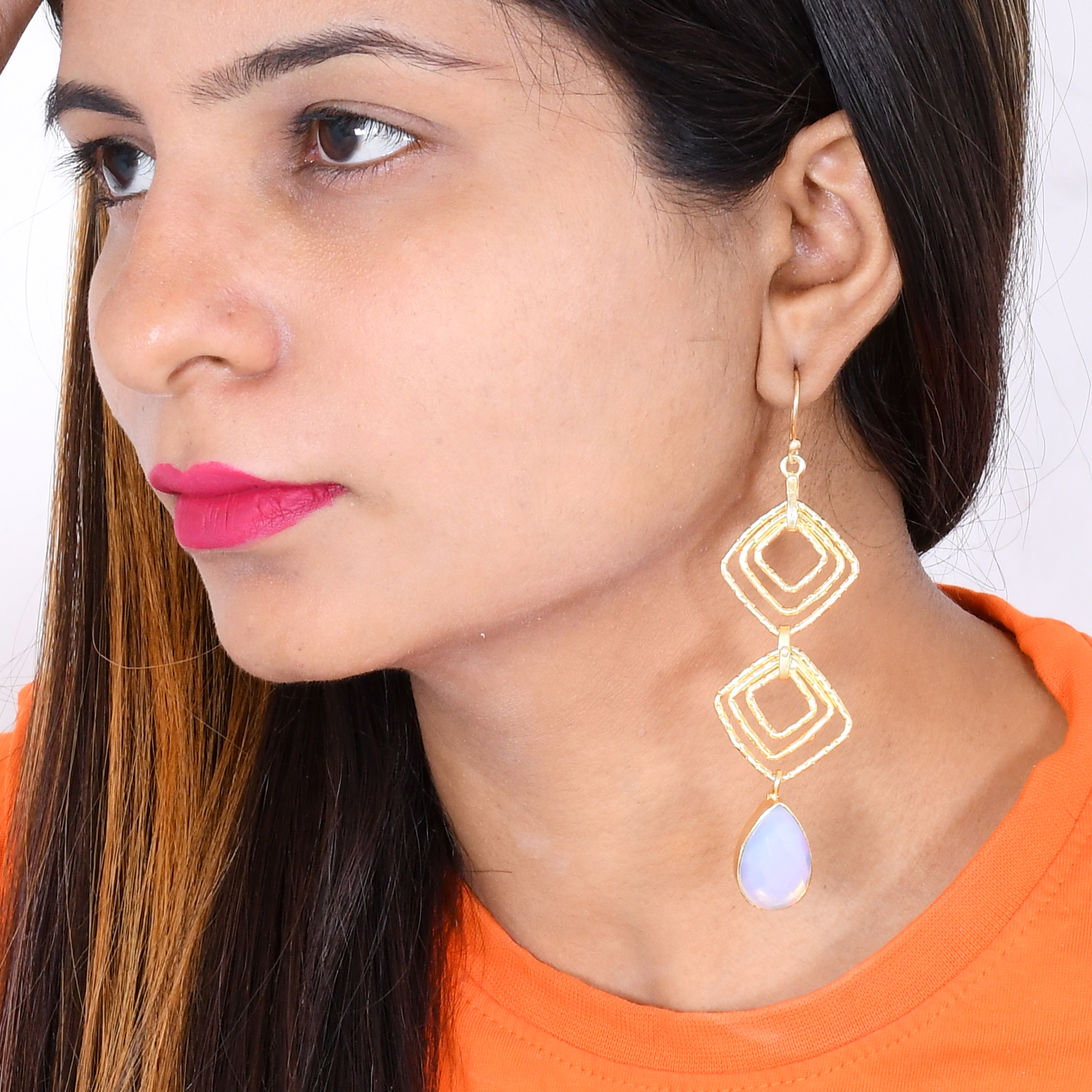 Designed for a dreamy wedding earrings, this 18K yellow gold plated long dangle earrings featuring wire wraps and a blissful opalite stones are quite a trendy designer bridal earrings of your dreams.
