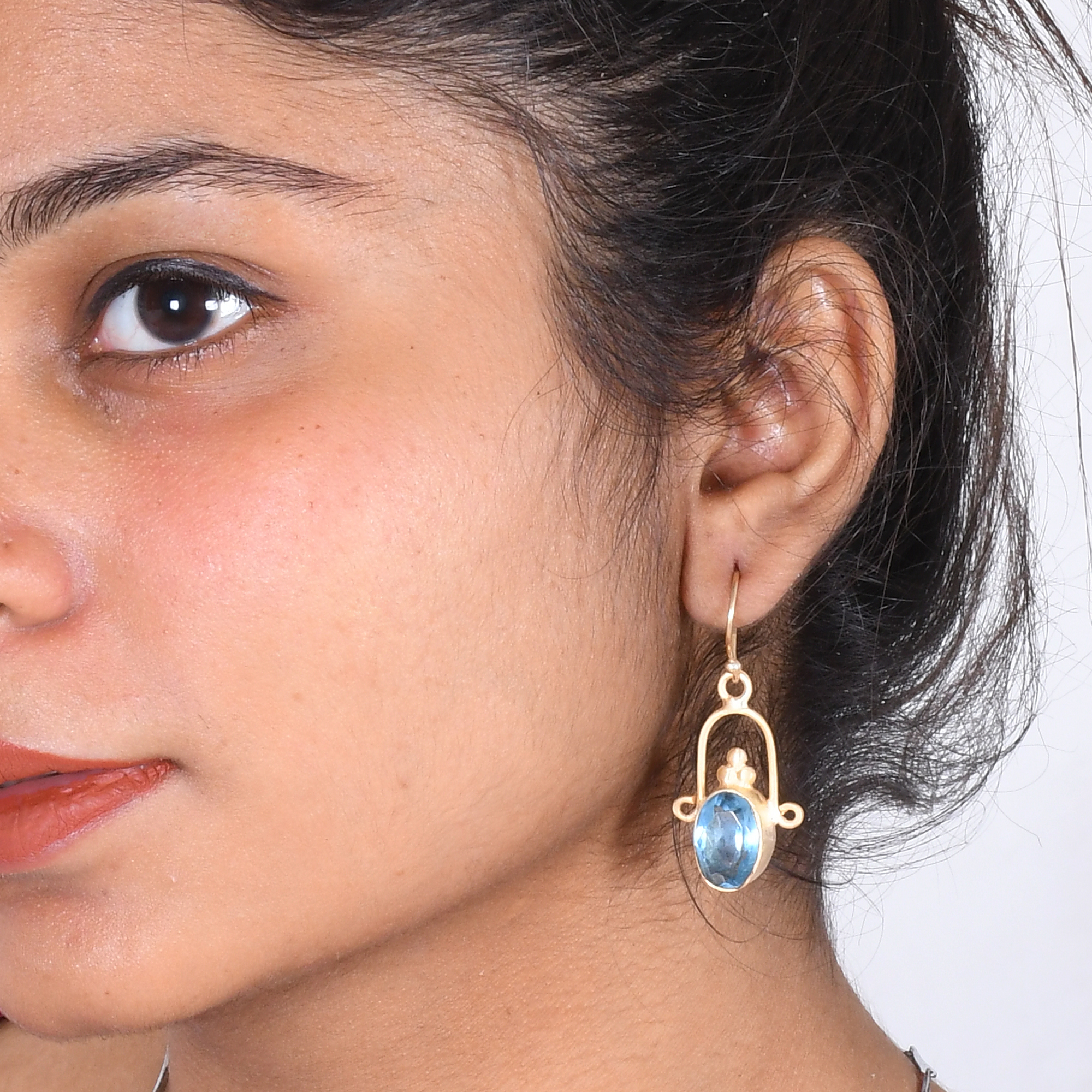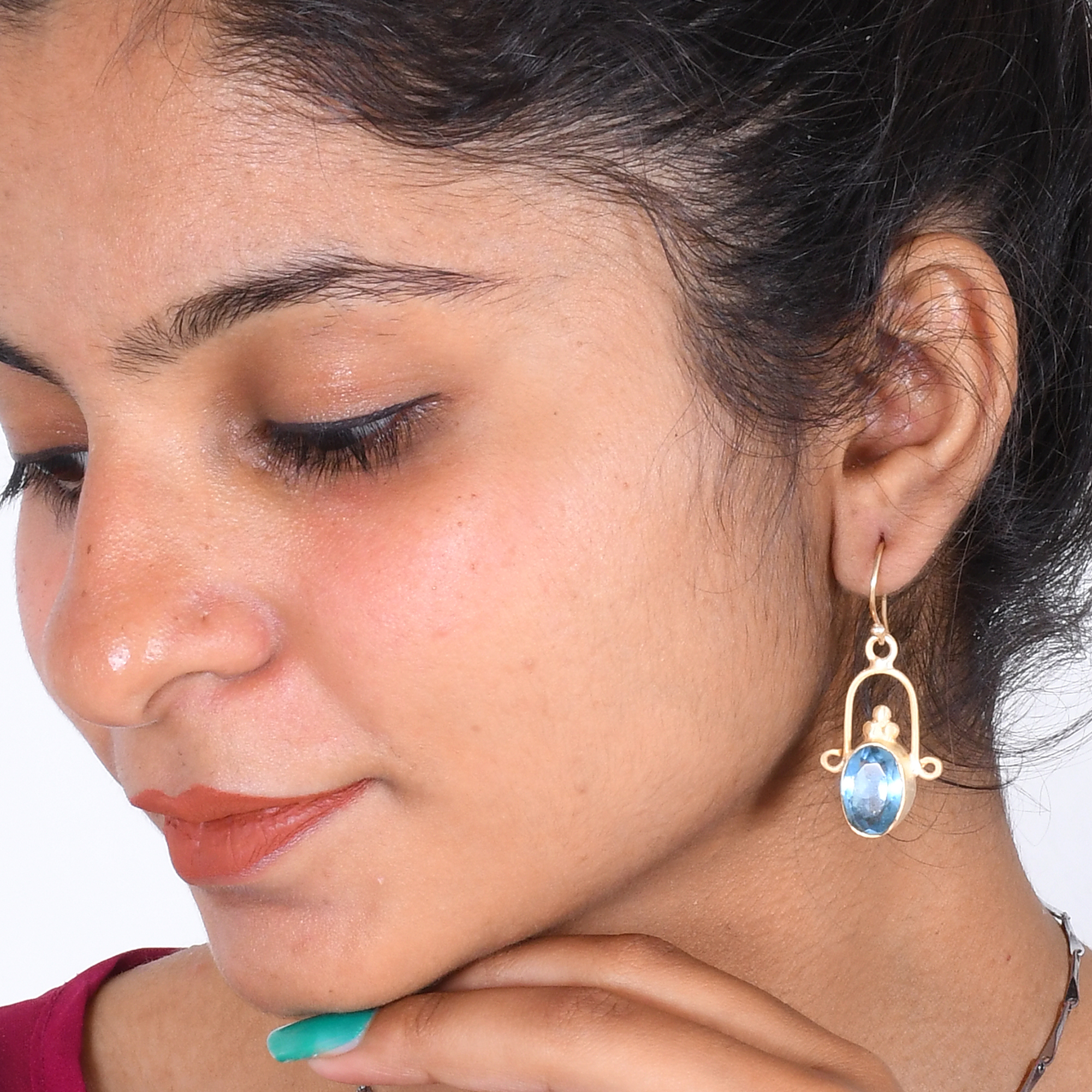 Handmade delicately by our artisan, this earring has just stepped out of a fairytale. The fine metalwork is 18k gold plated brass and is encrusted with a tantalizing blue quartz. The fine gemstone is like its beautiful calming blue colour, it has a cool and calming effect on the wearer. This stone has been known to redirect, stimulate, heal, recharge, and soothe the energies of your body. Affordable and unique it is the perfect way to show your love.