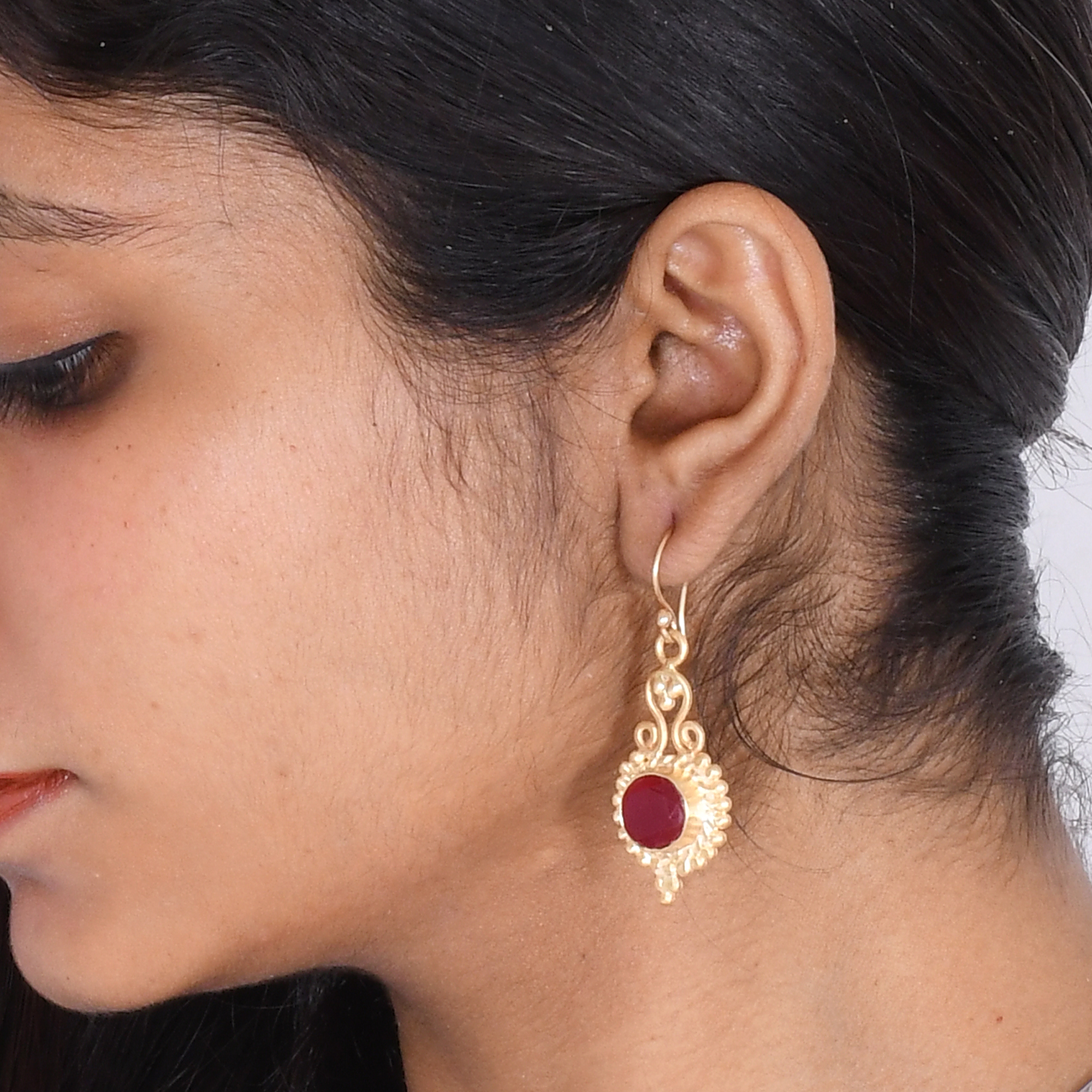 Bohemian Style Round Shape Red Corundum Birthstone Drop Earrings