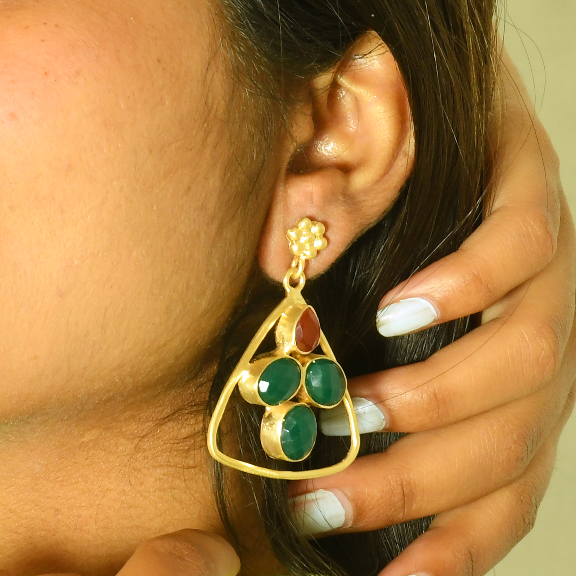 Indian artisan use brass the base of the earring to give the design strength and create intricate twisted wire around the gemstones. We have used a green onyx and red onyx in our designs to complete the dangle earrings. We are committed to create affordable fashion that spells luxury.