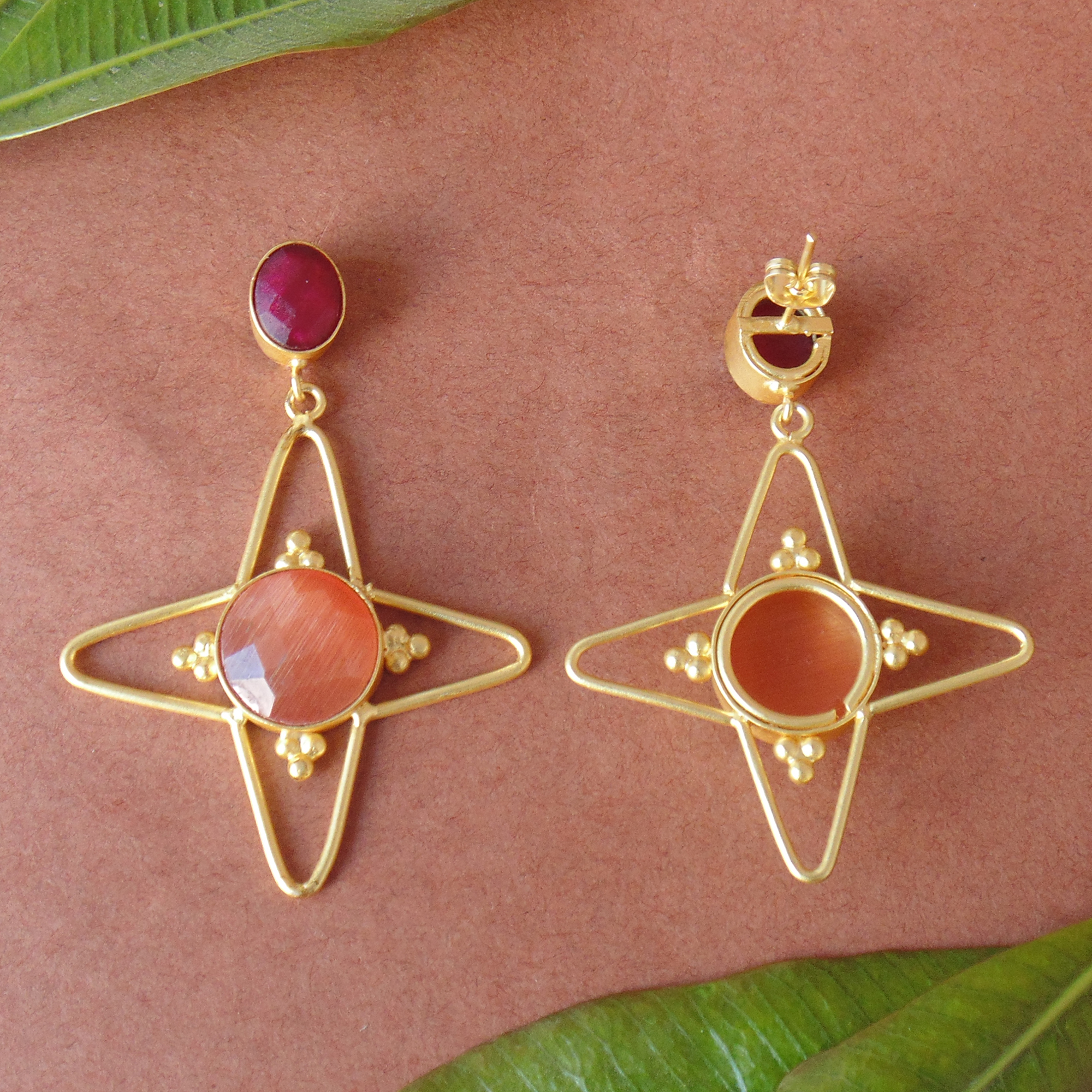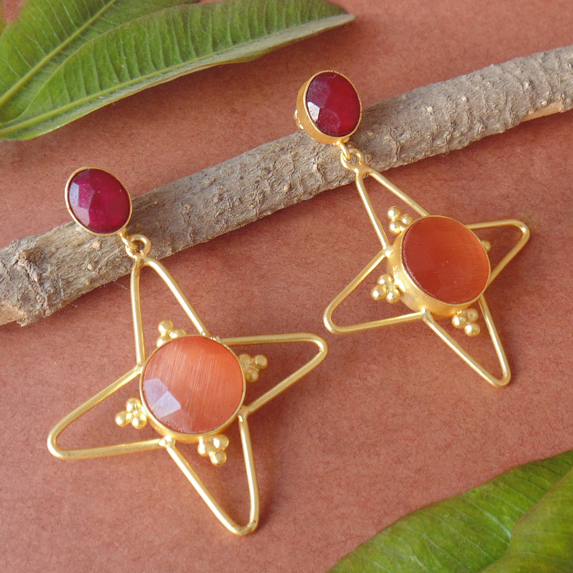 Elegant 18K Gold Vermeil Ruby Corundum And pink Monalisa Gemstone Metal Earrings