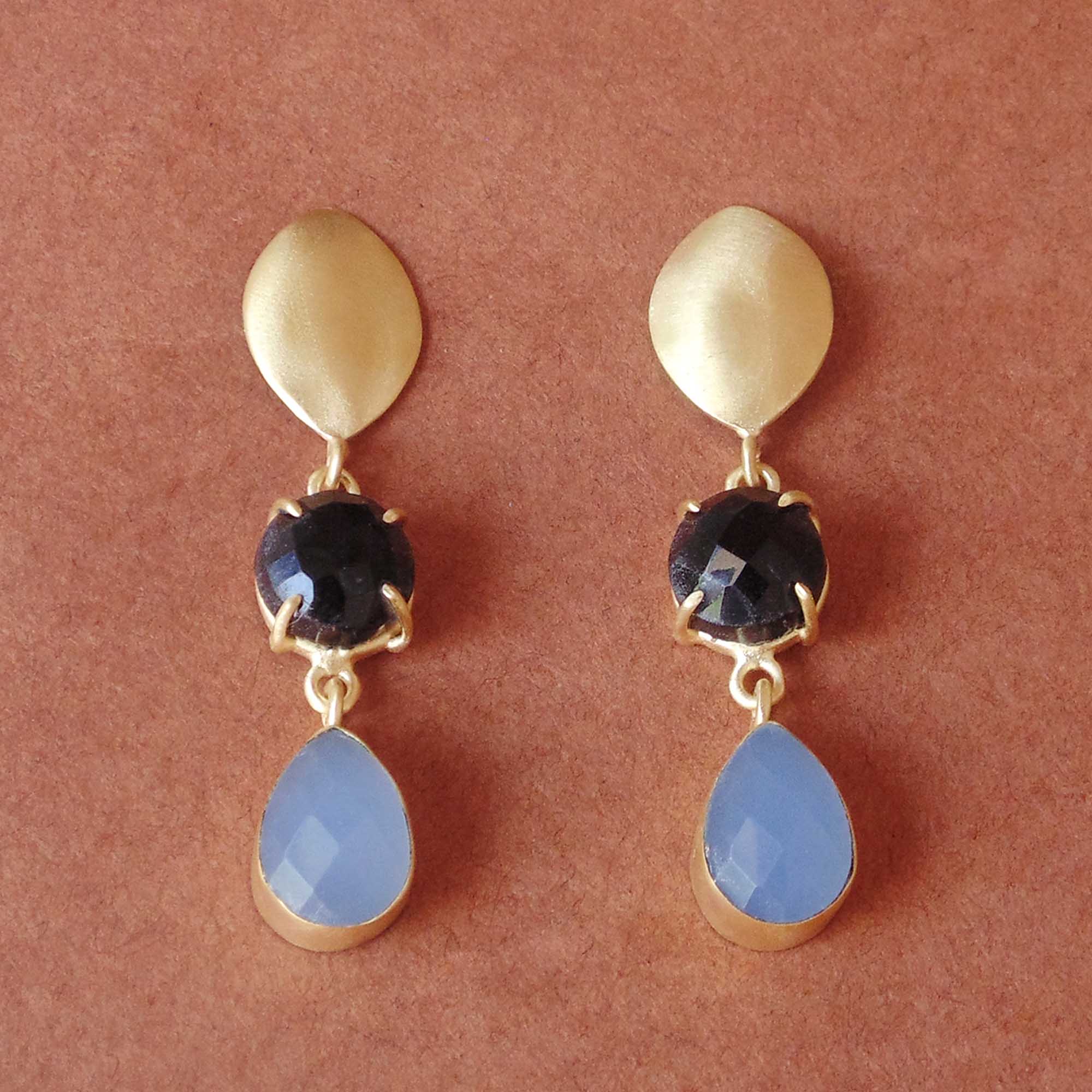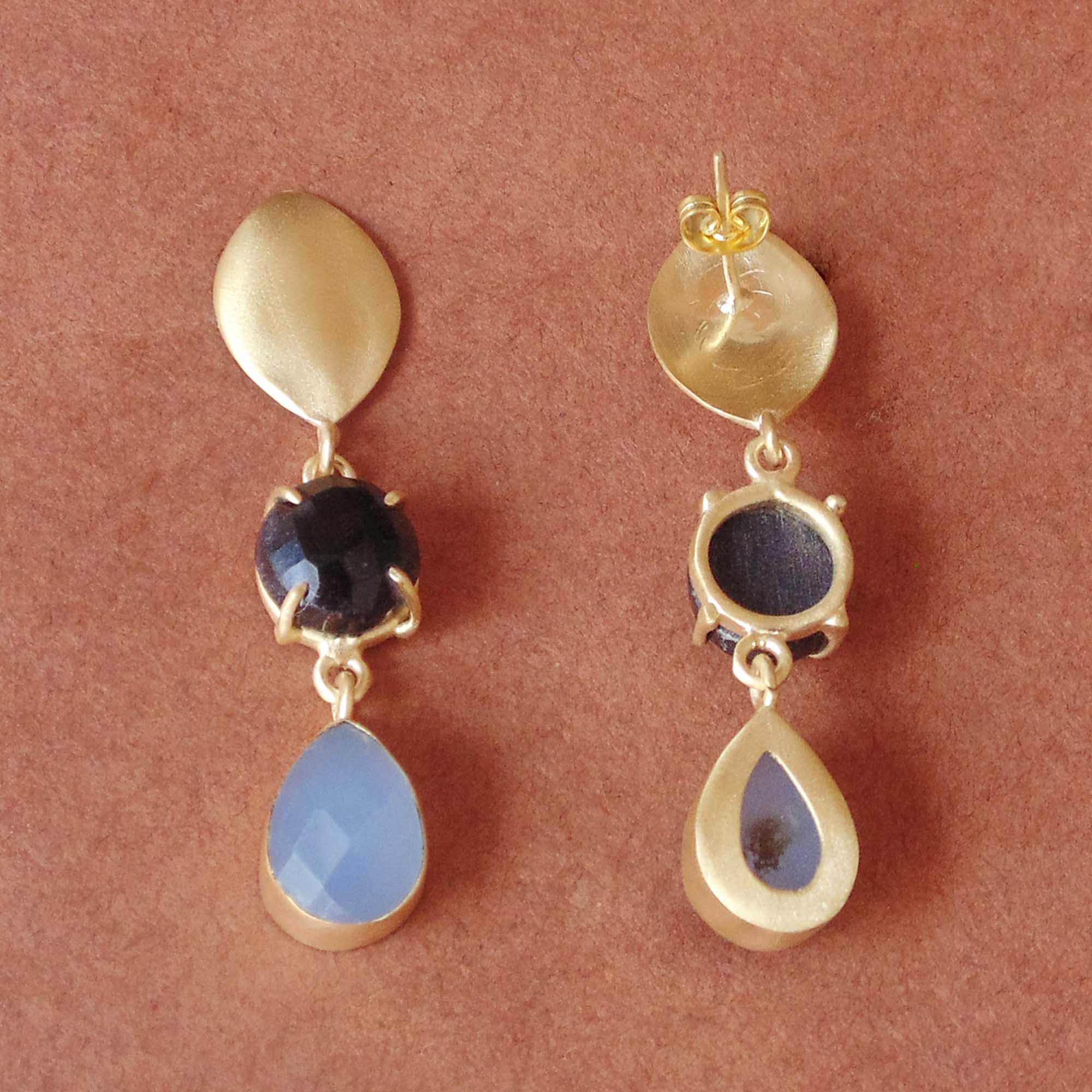 Phenomenally designed the vibrant blue chalcedony against black onyx and matte gold is a cinematic vision comes to life. Artisans have crafted this graceful pair of matte gold plated, Prong set dangle earrings to create an artistic statement. Let people covet this stunning pair and get ready to stand out with this beautiful pair.