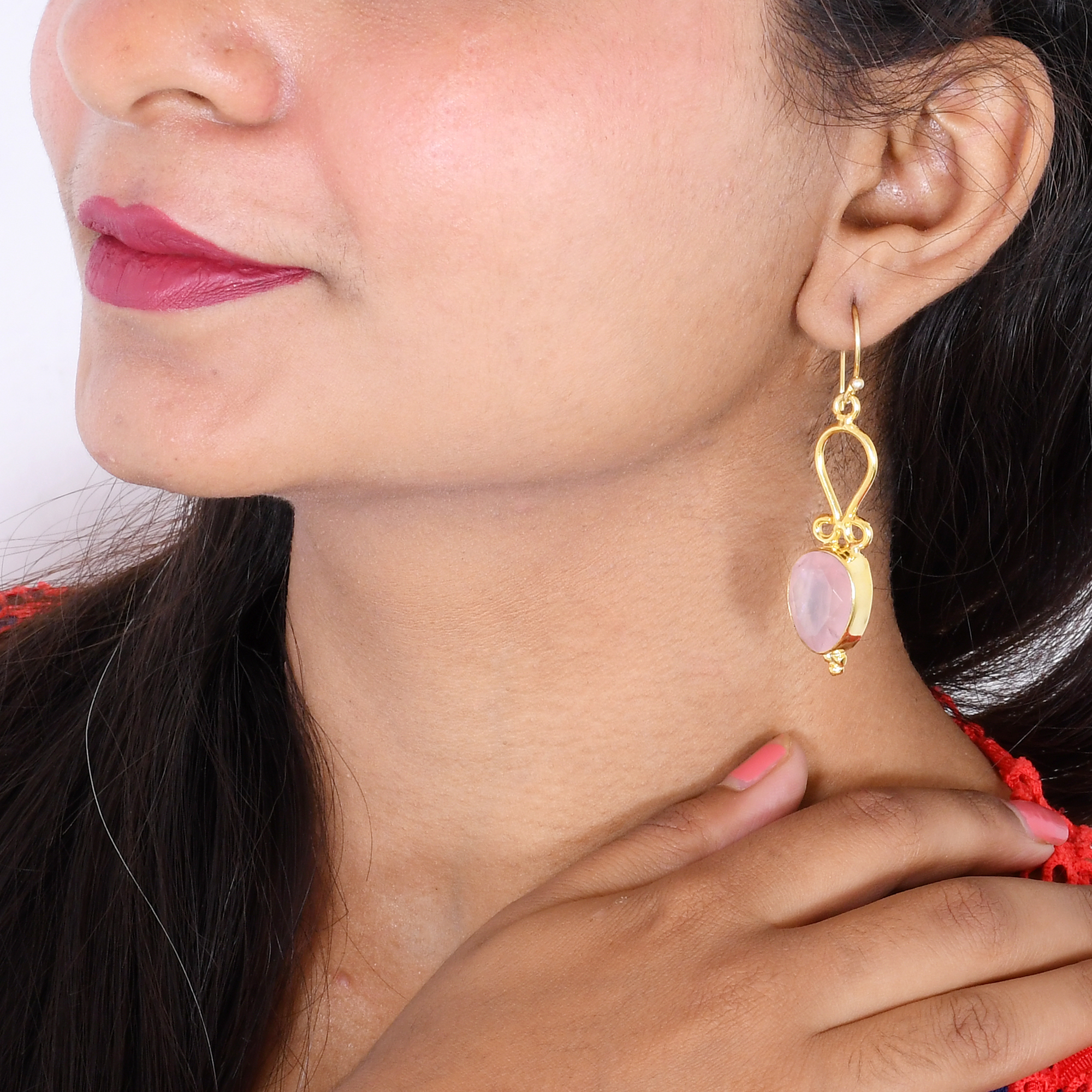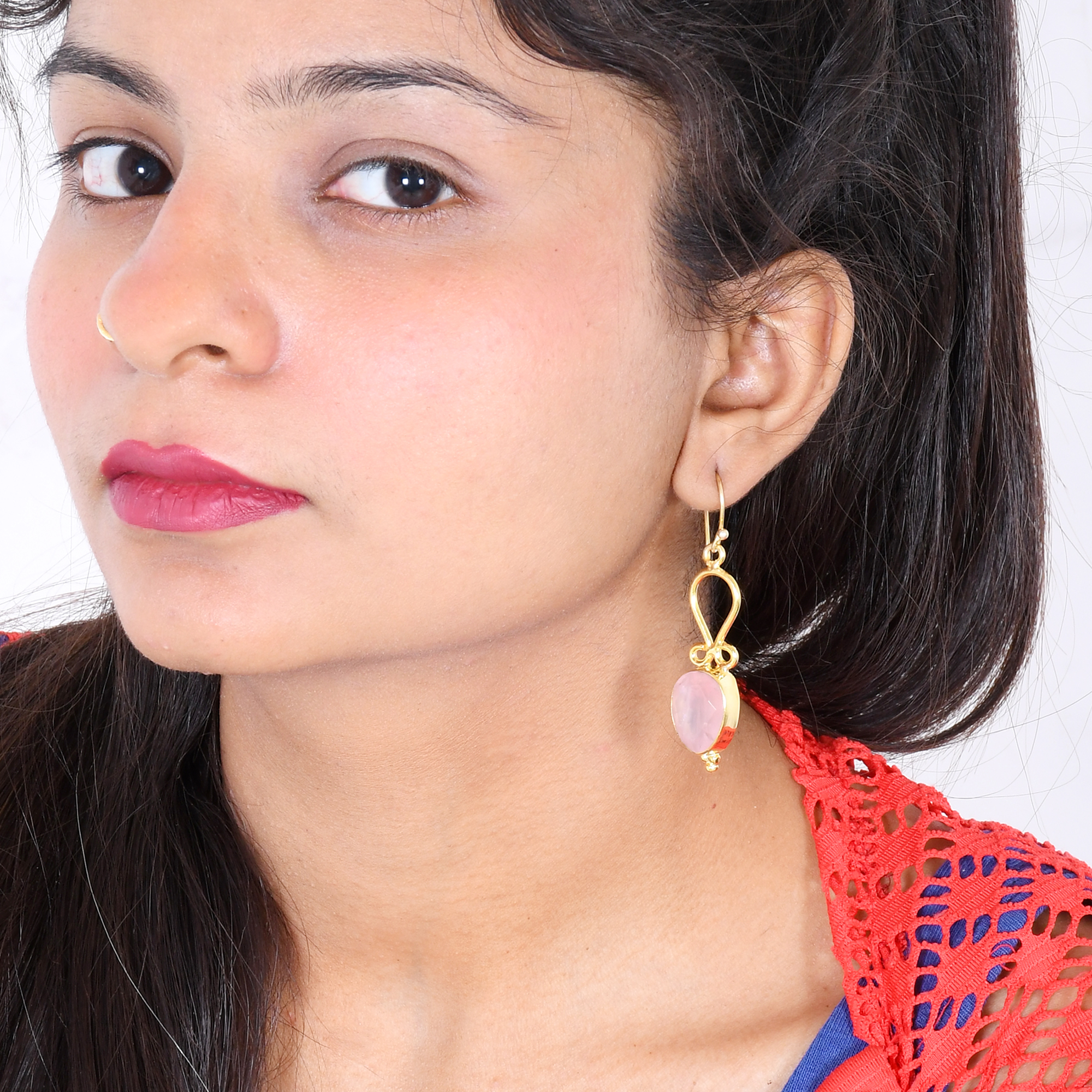 Pretty in pink the rose quartz with its dainty metal work is what we like to imagine budding roses during spring. Our artisans have created this delicate beauty adding the wire hook to add movement and flexibility in the design. We have used 18k gold plated brass to lend strength to the delicate work but keeping lightweight so that you can wear them effortlessly throughout the day.