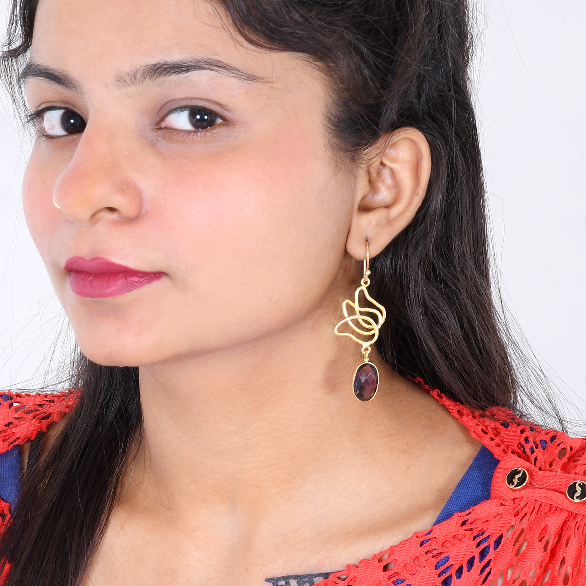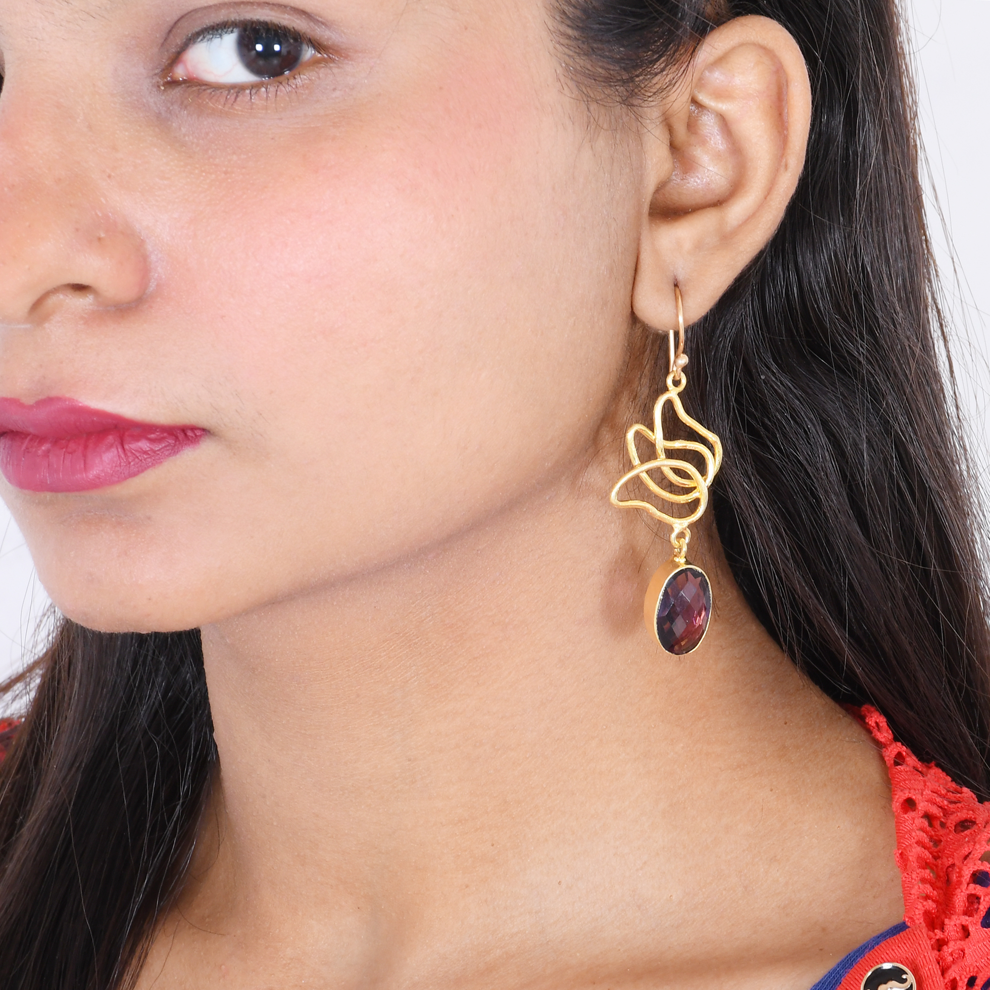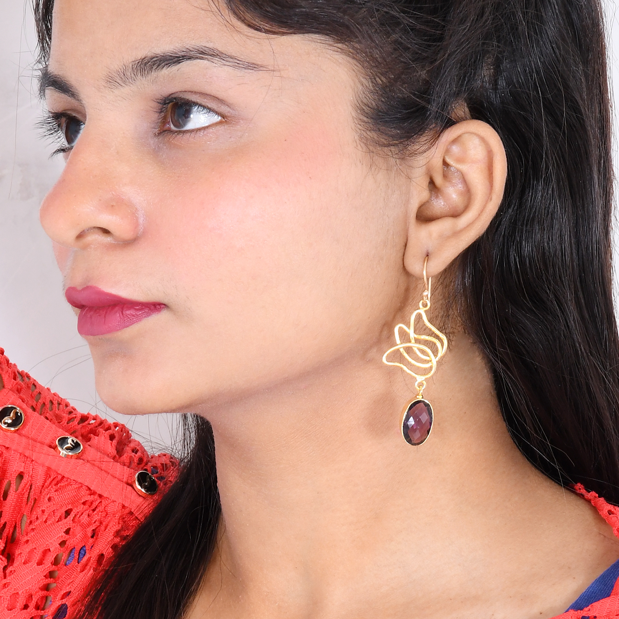 Resplendent 18k gold-plated amethyst dangle earrings. Modern, novelty designer earrings are a unique gift for her. Handmade from scratch by our meticulous Indian artisans, it is designed and made proudly in Jaipur, Rajasthan.
