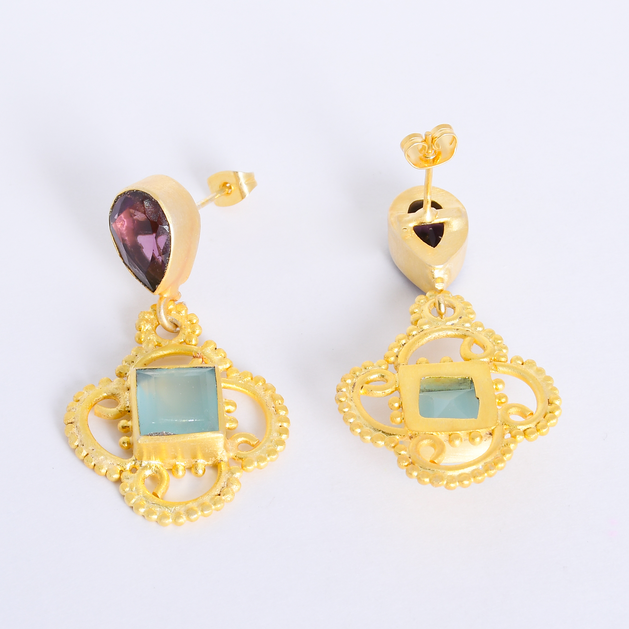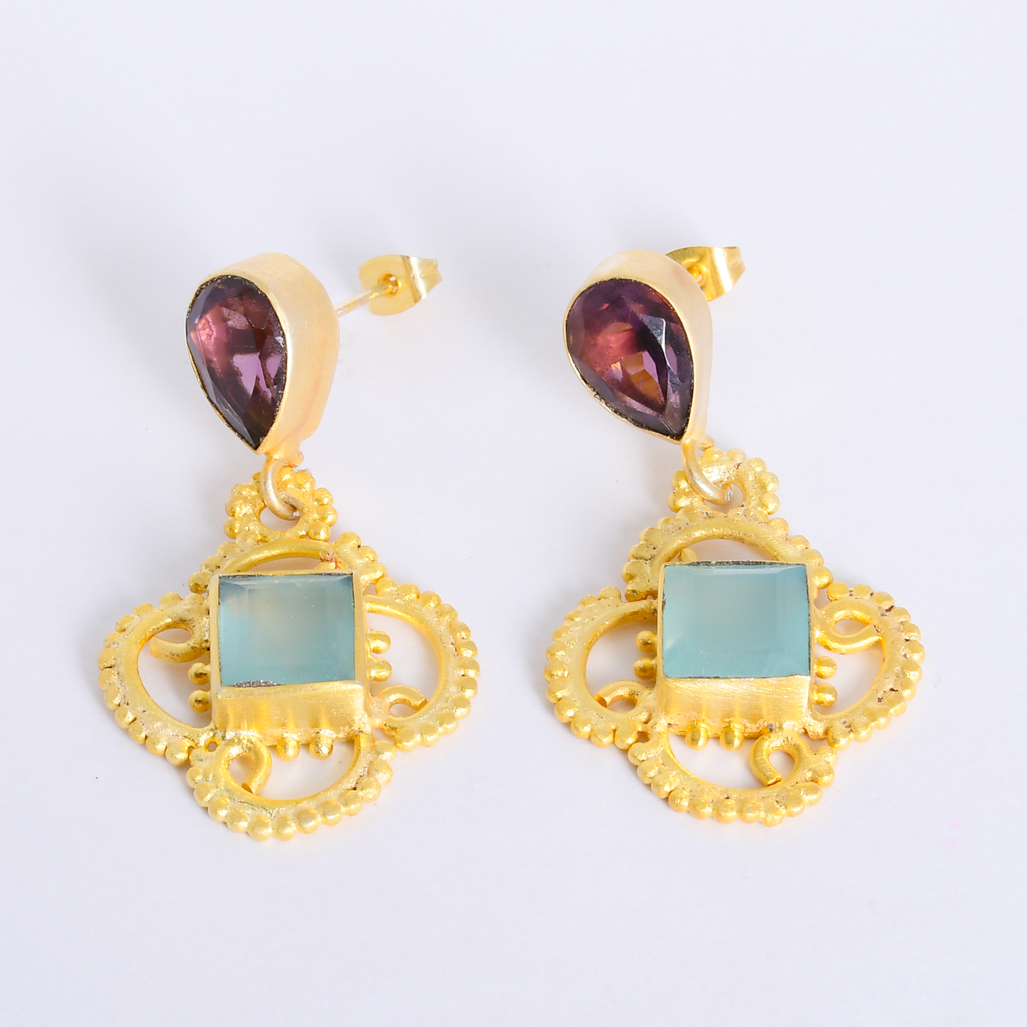 Handmade by our local artisan in high-quality brass, this is made for the Bohemian soul. The intricate design is the result of hours of labor and flaunts an aqua chalcedony and amethyst quartz. The intricate design exudes a timeless elegance. Affordable and lightweight, they make an unexpected gift.
