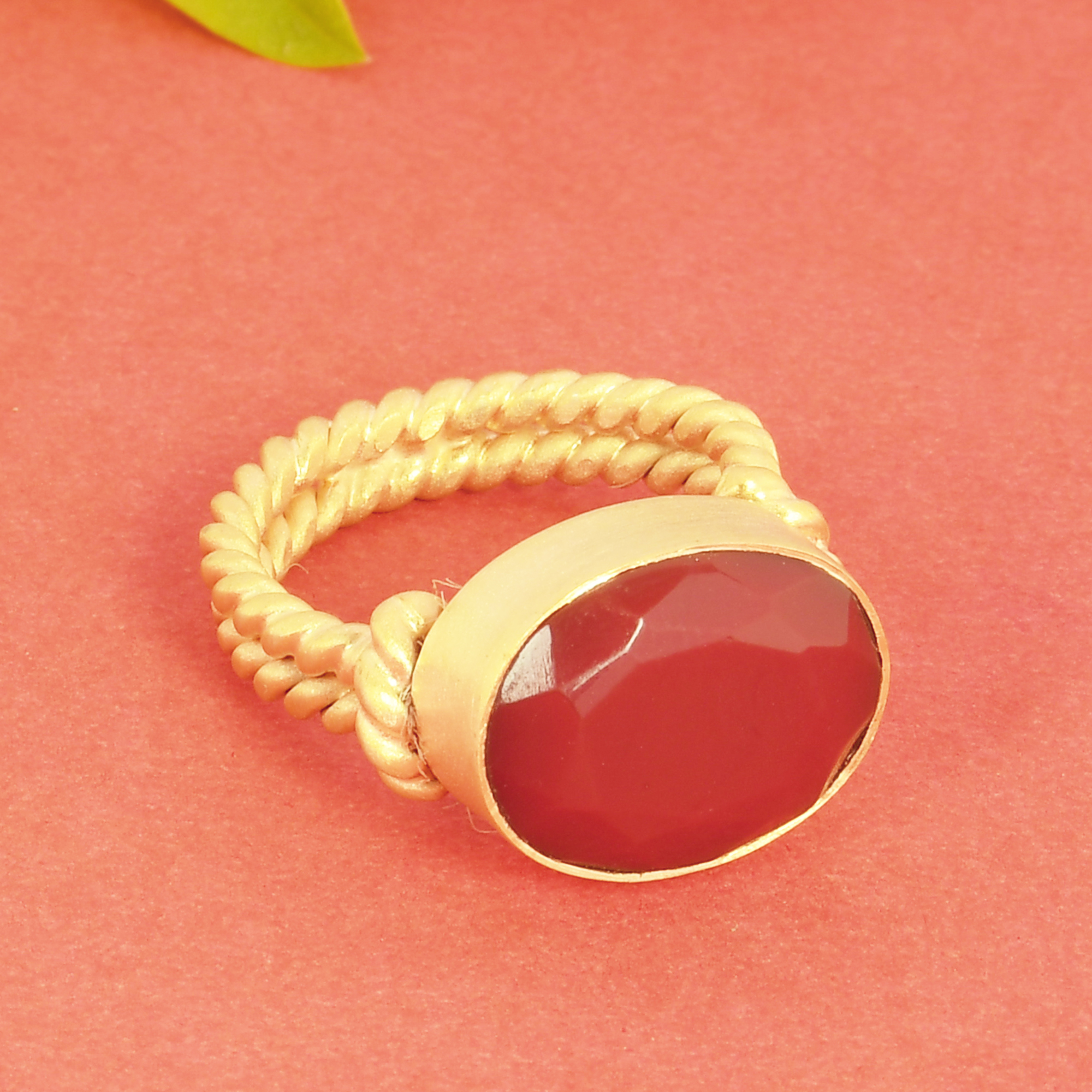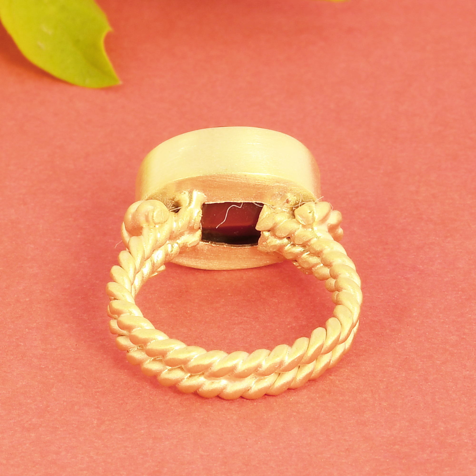 Vintage-inspired, wire twisted ring is completely handmade in India. The artisan-made ring is studded with an oval synthetic red coral and brushed finish twisted wire in 18k yellow gold. The design is subtle and unique and is the perfect gift for a fashionable friend or partner.